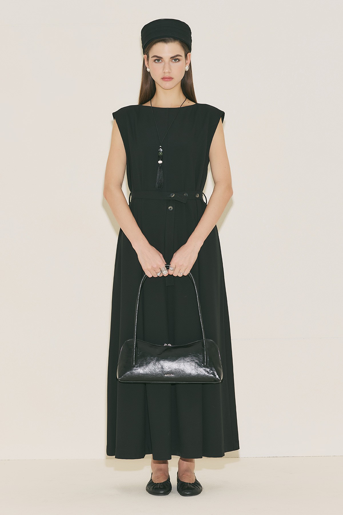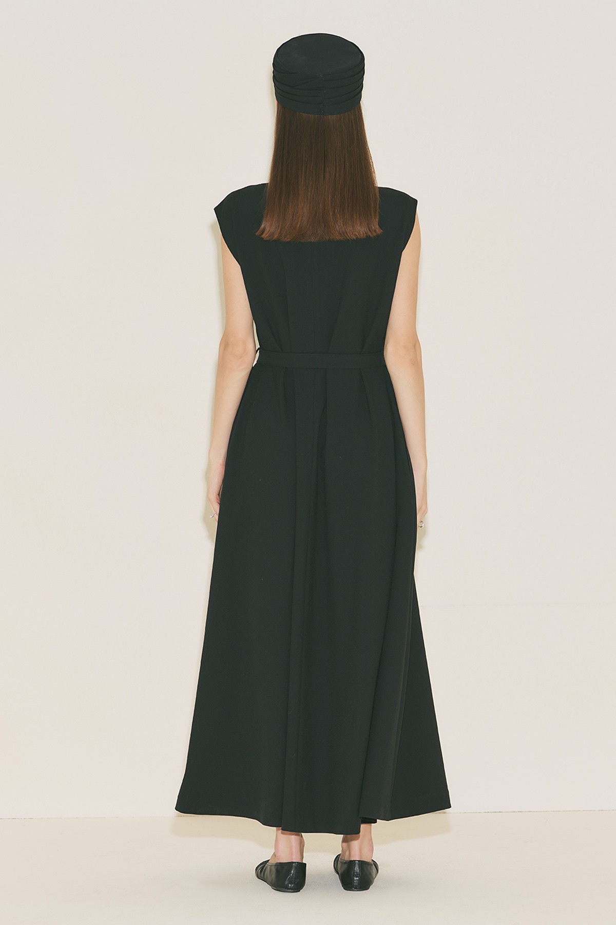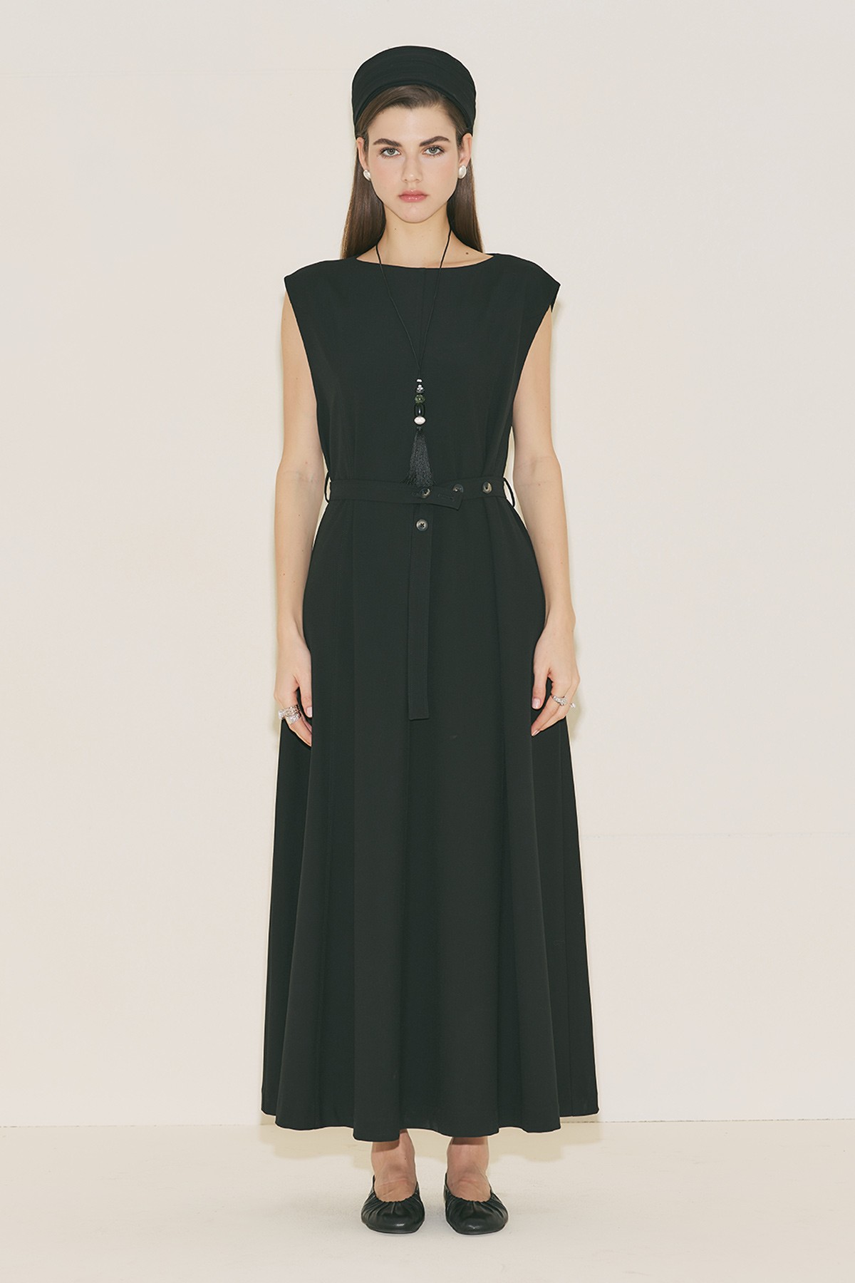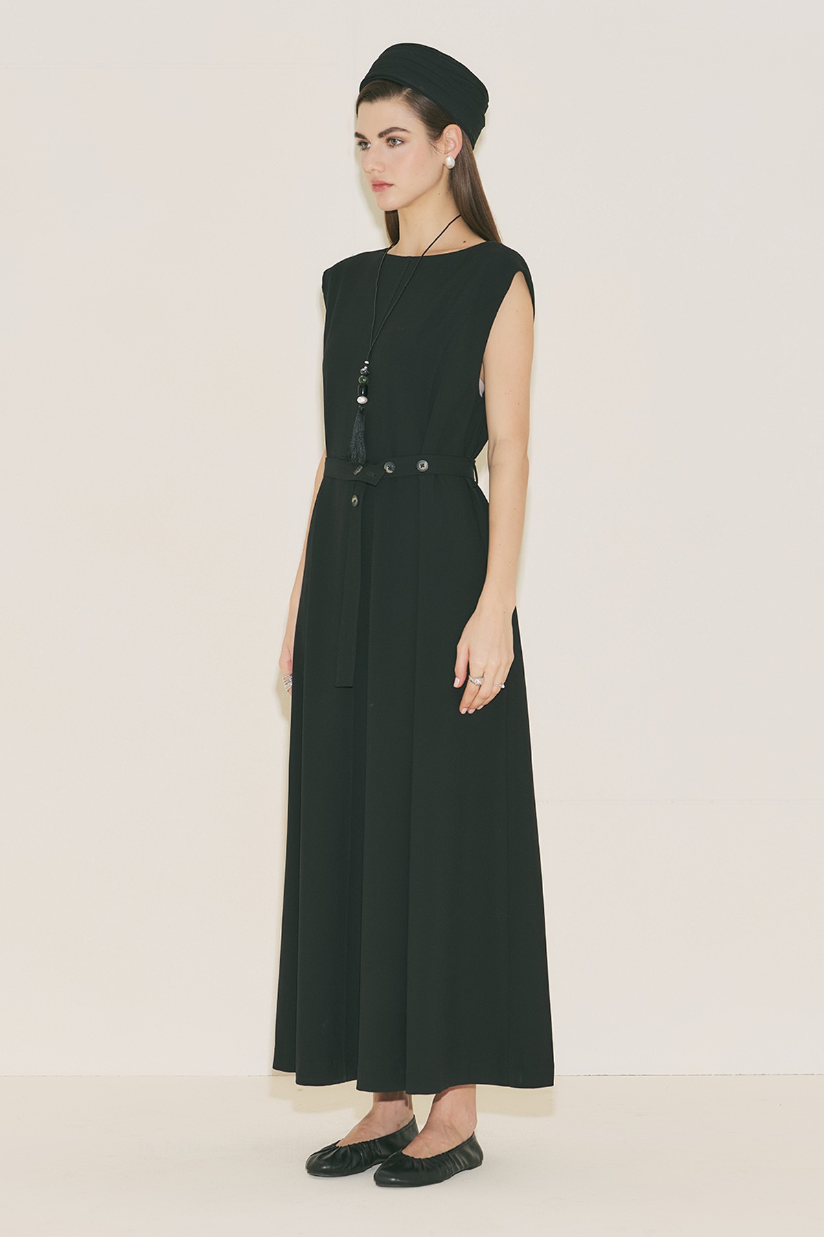 Fit form, kayık yaka, kolsuz, tam boy, kuşakta düğme detaylı, cepli, fermuar kapamalı.