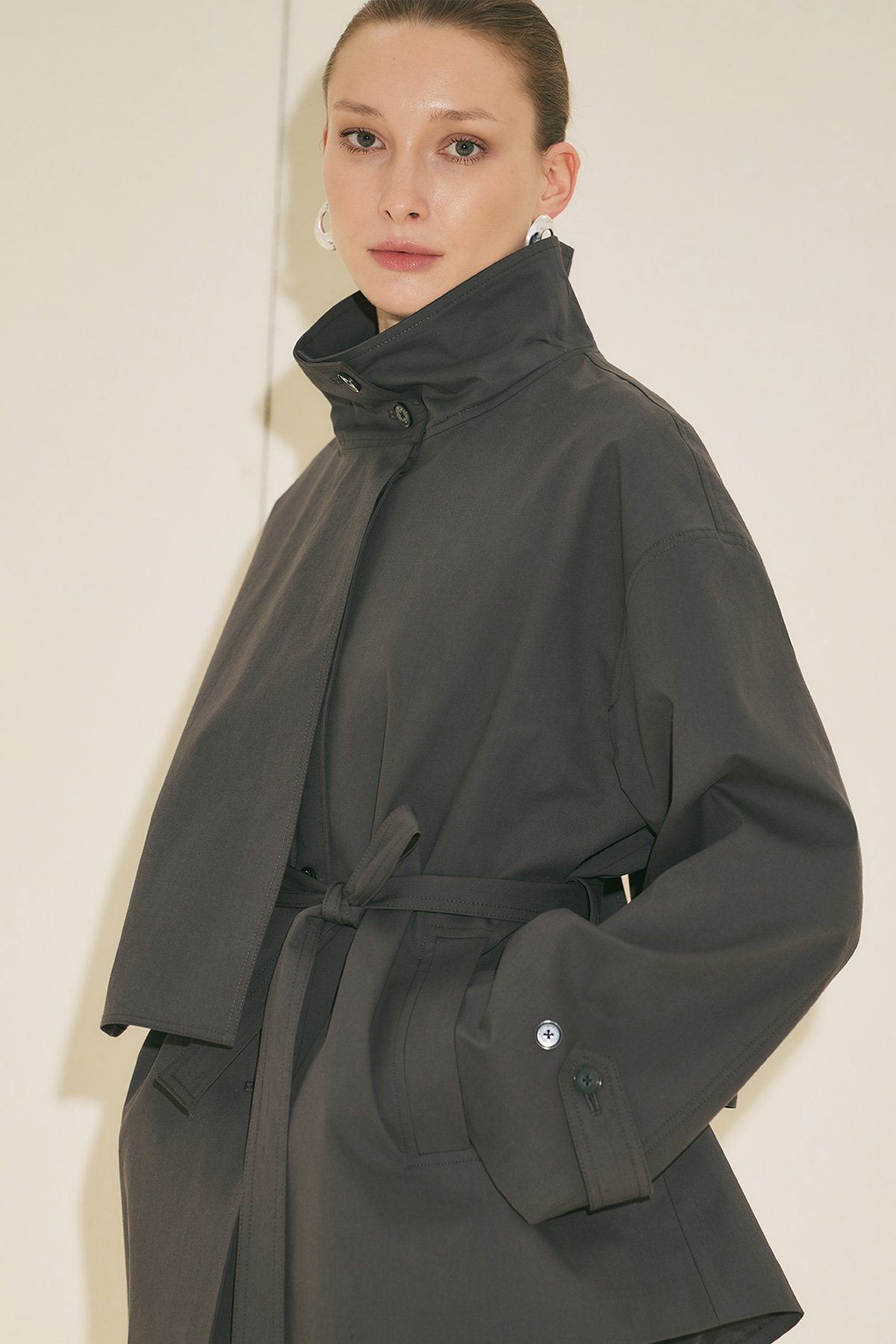 Regular form, yüksek yaka, uzun kol, ara boy, rüzgarlıklı, cepli, kuşaklı pile detaylı, düğme kapamalı.