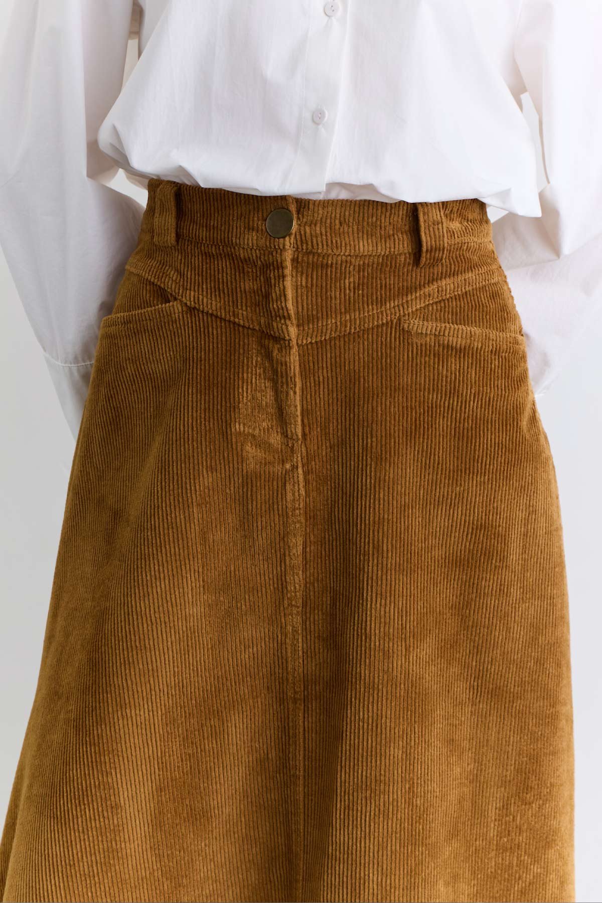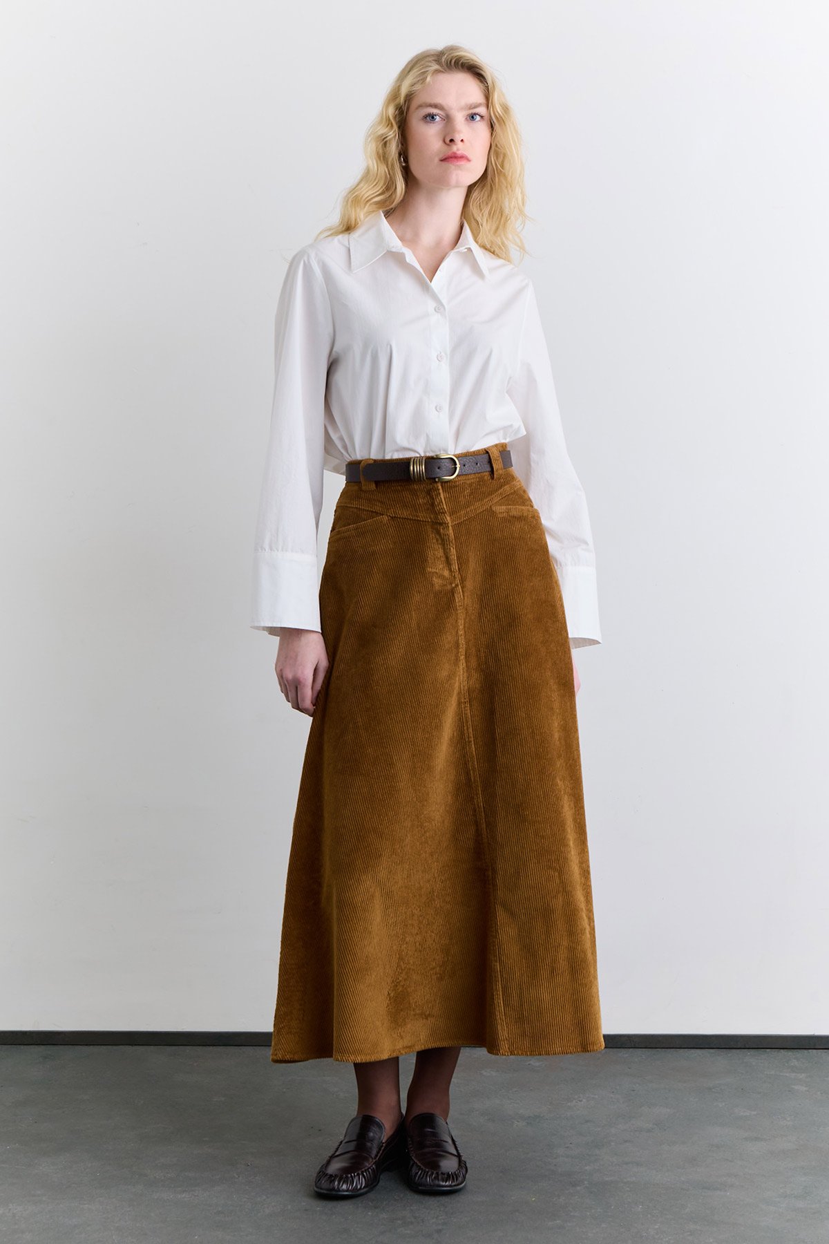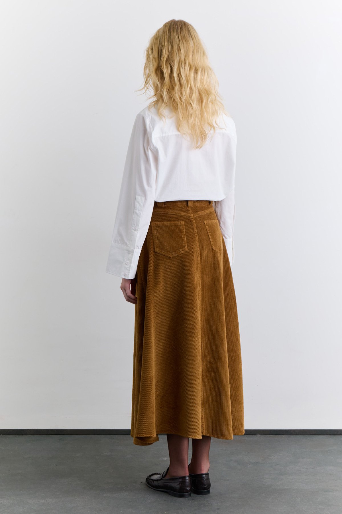 High waist, button and zipper fastening, side and back pocket details, slightly flared hem, made of corduroy fabric.