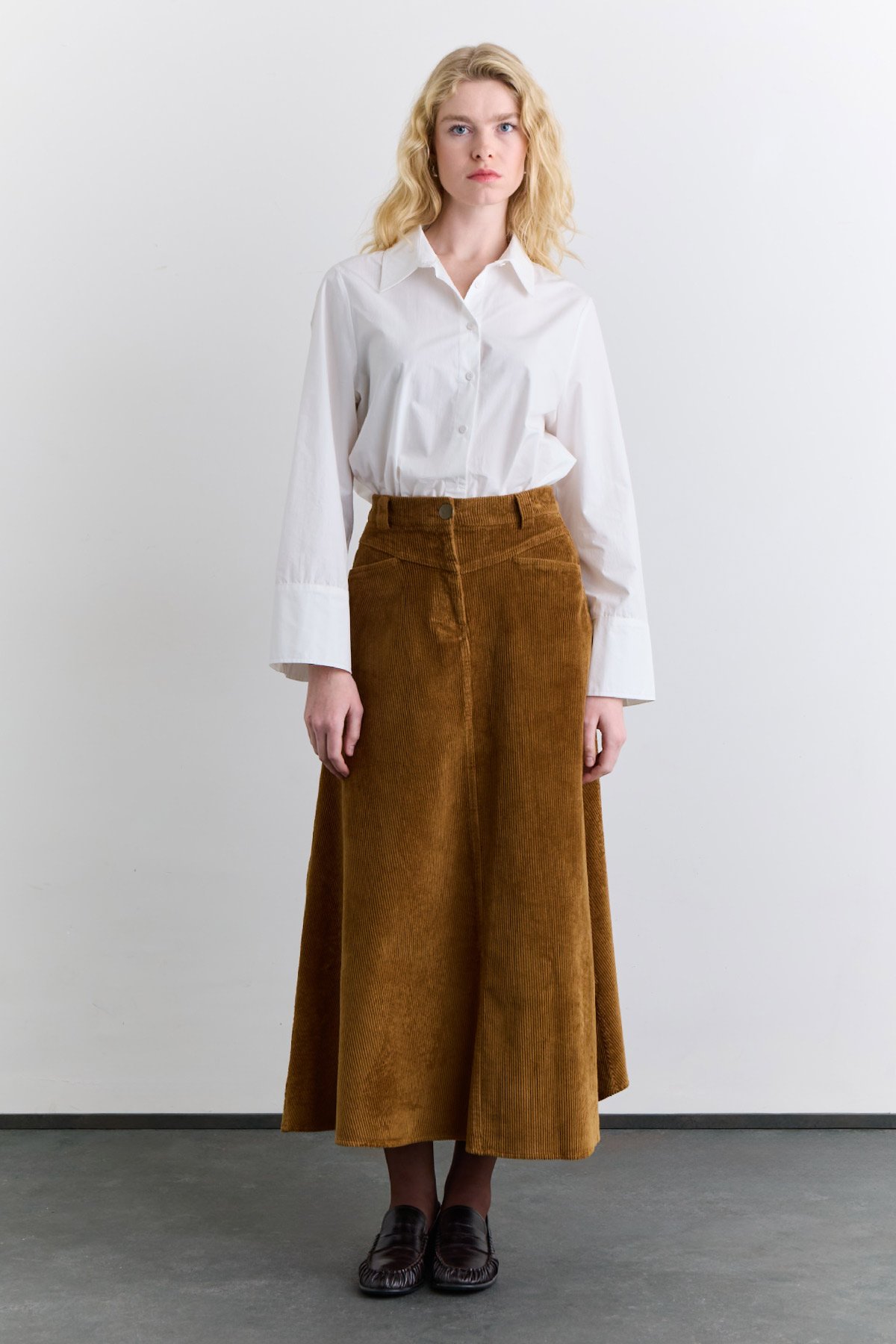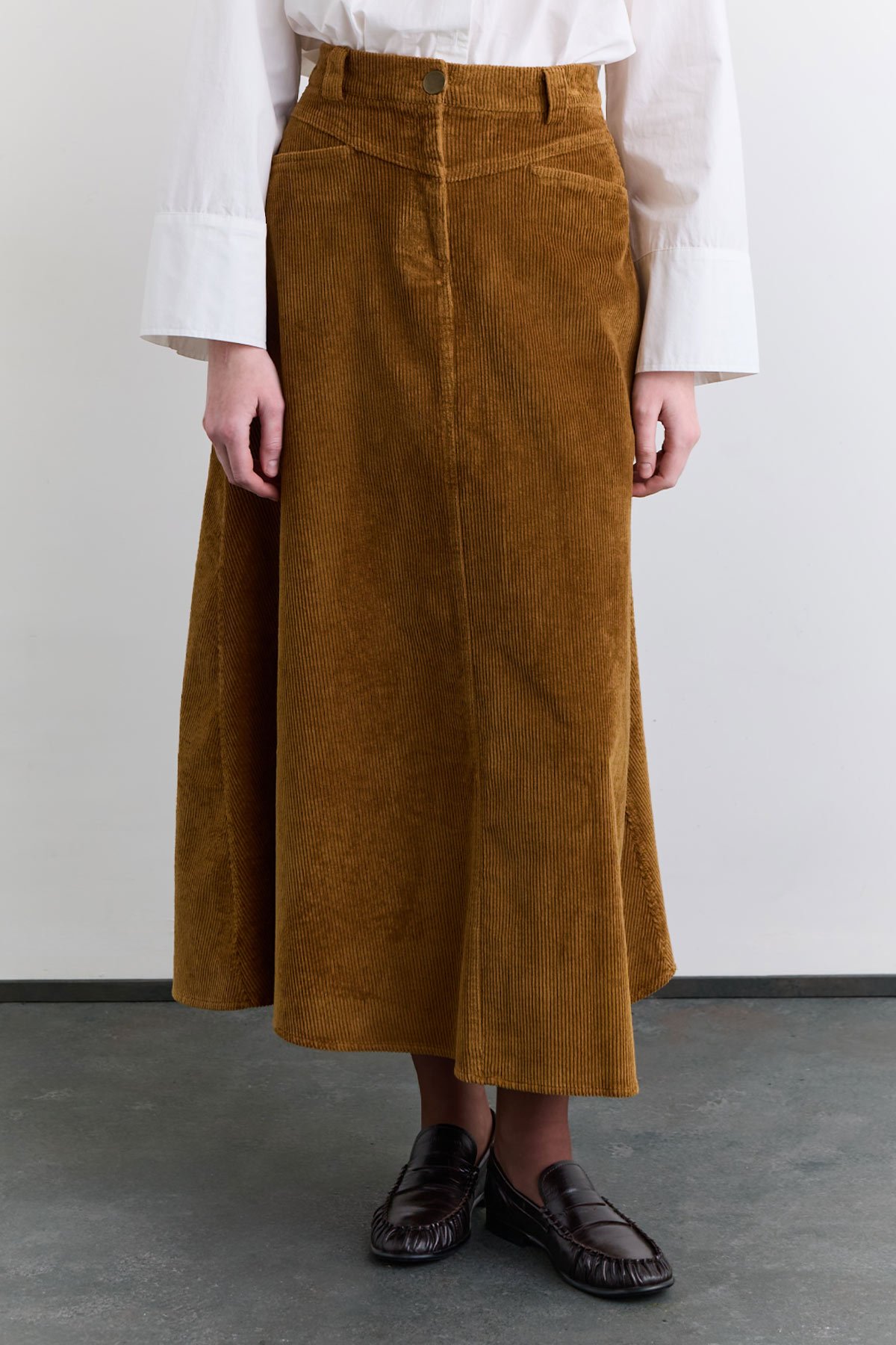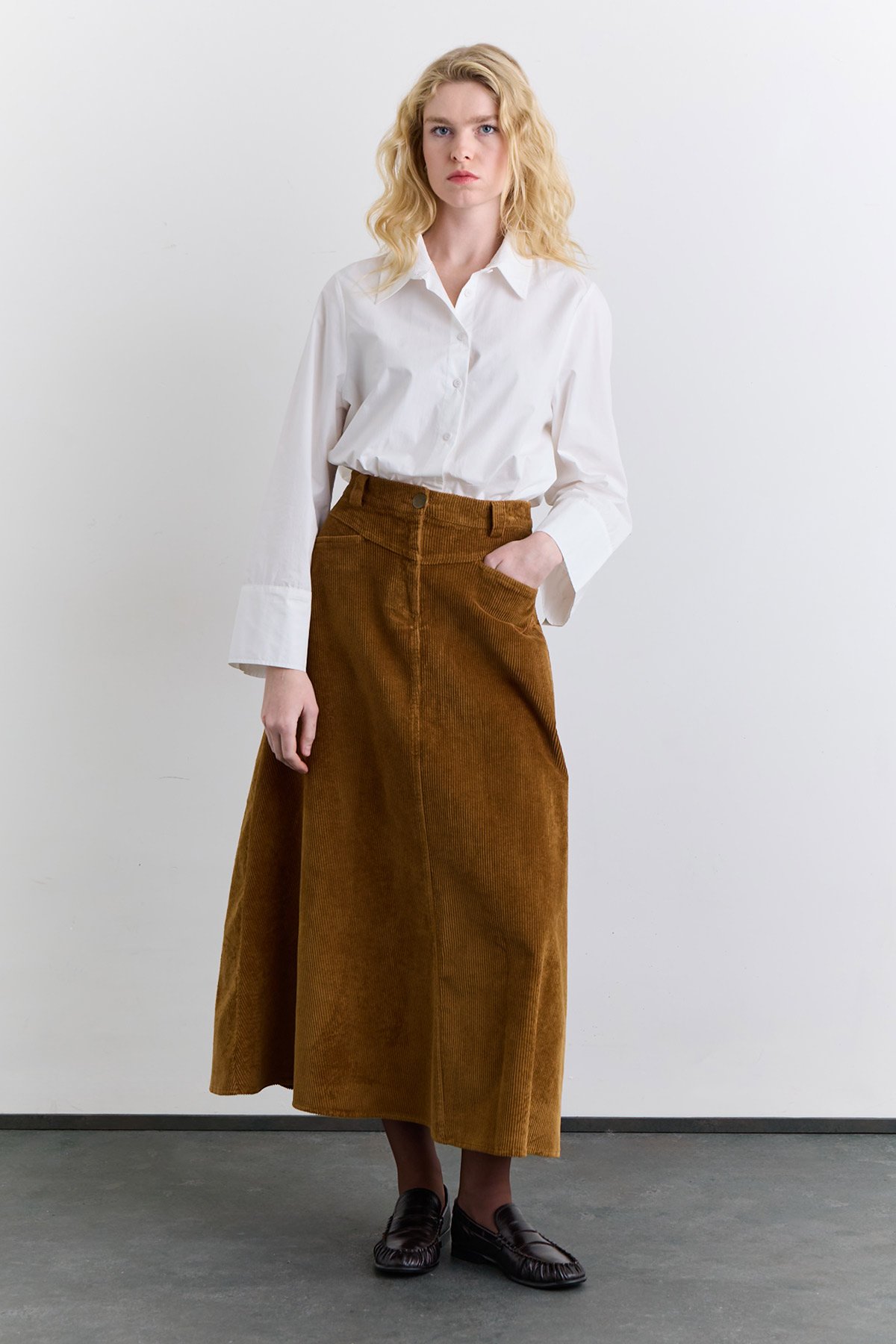 High waist, button and zipper fastening, side and back pocket details, slightly flared hem, made of corduroy fabric.