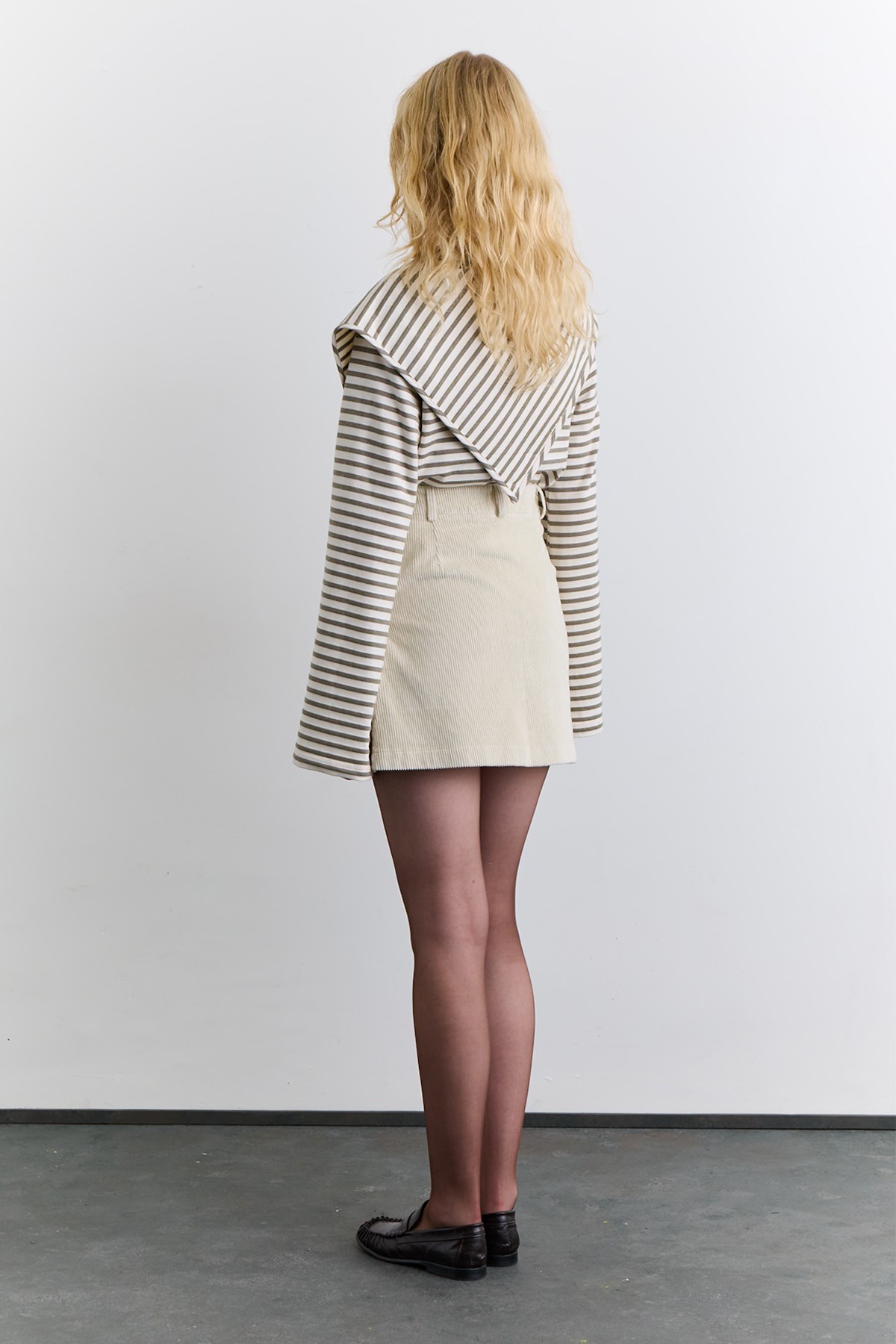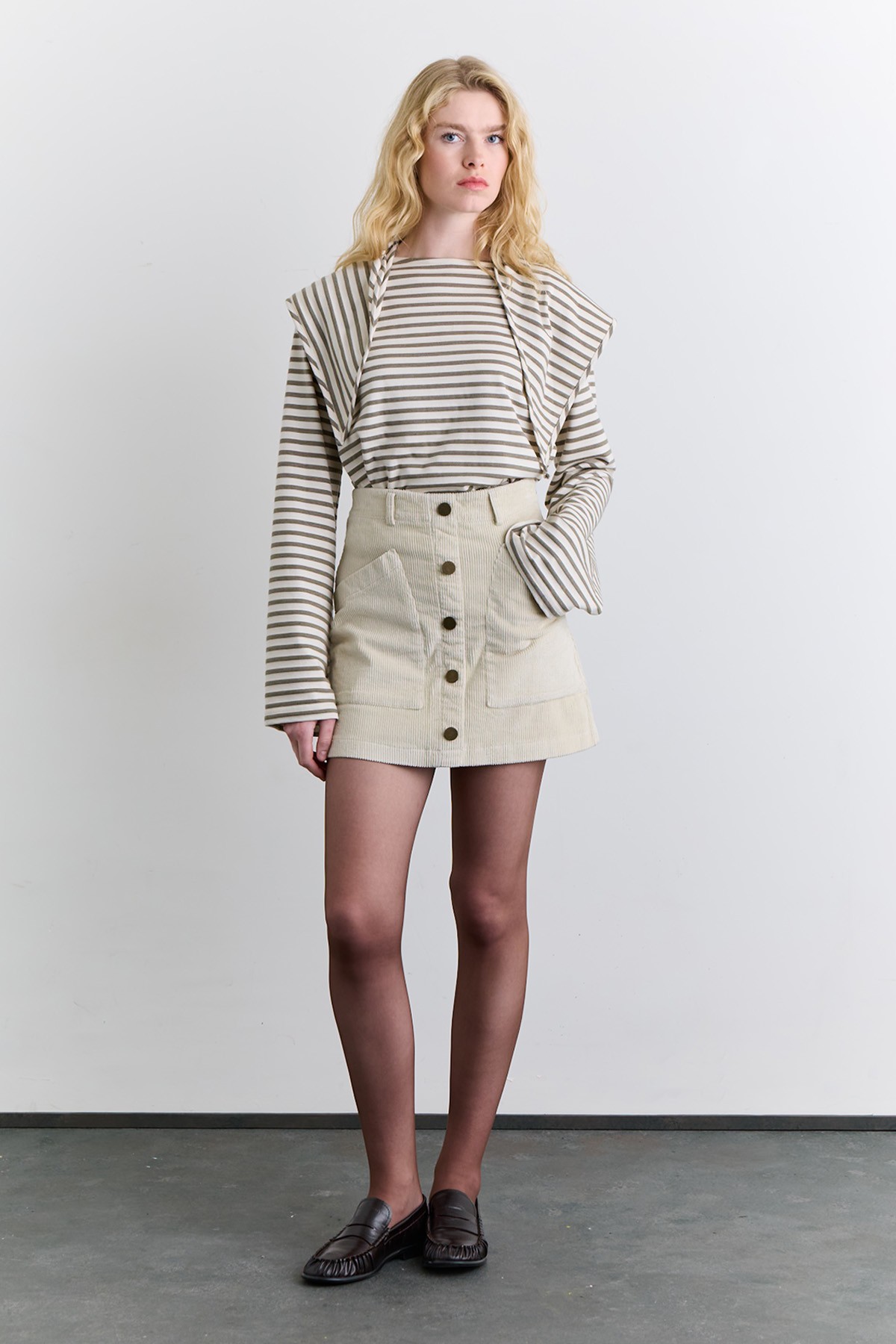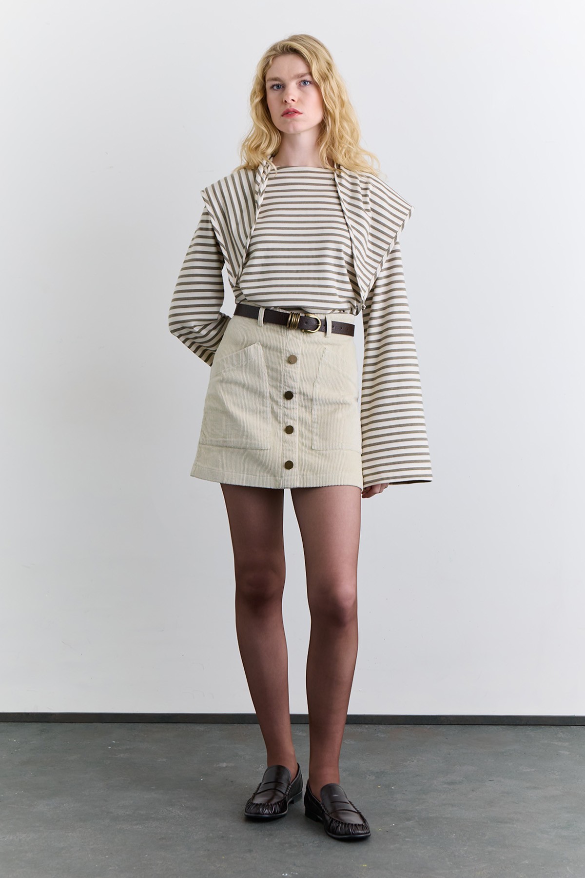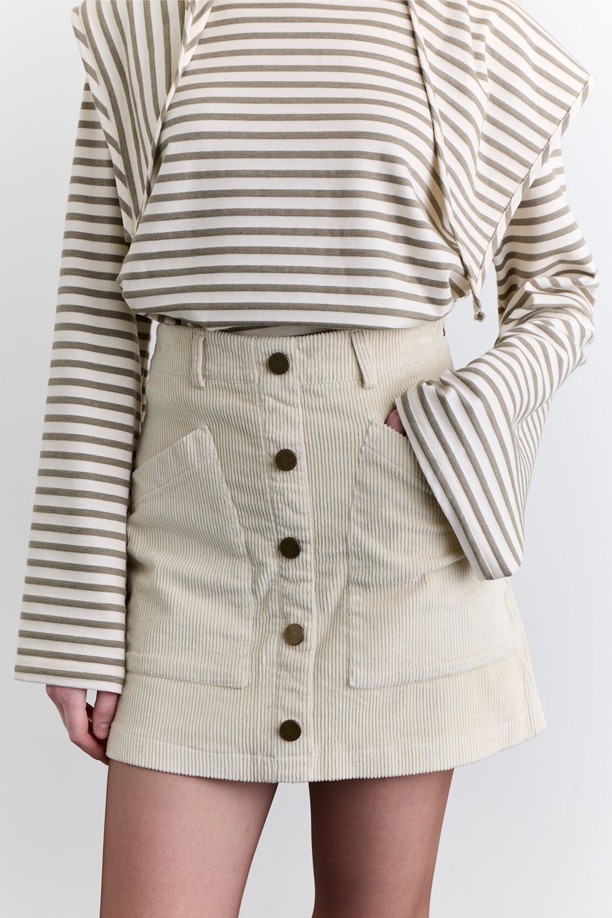 High waist, side zipper fastening, decorative front button detail, pocket detail, mini skirt.