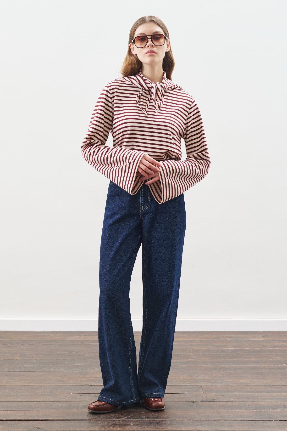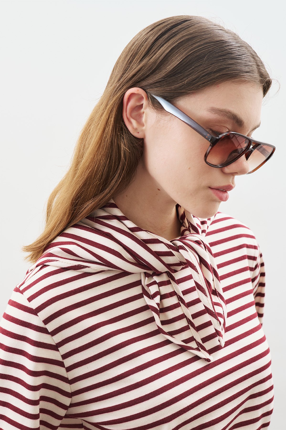 ŞAL DETAYLI ÇİZGİLİ TSHIRT BORDO ürününde stoğu olan mağazalarımız.
