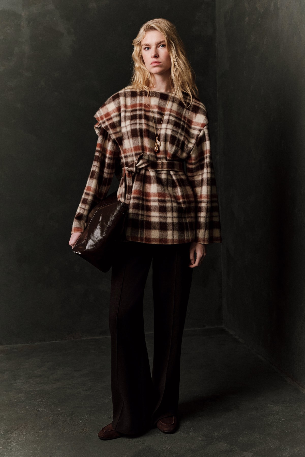 Regular kalıp, yuvarlak yaka, uzun kol, şal detaylı, ara boy, düğme kapamalı.