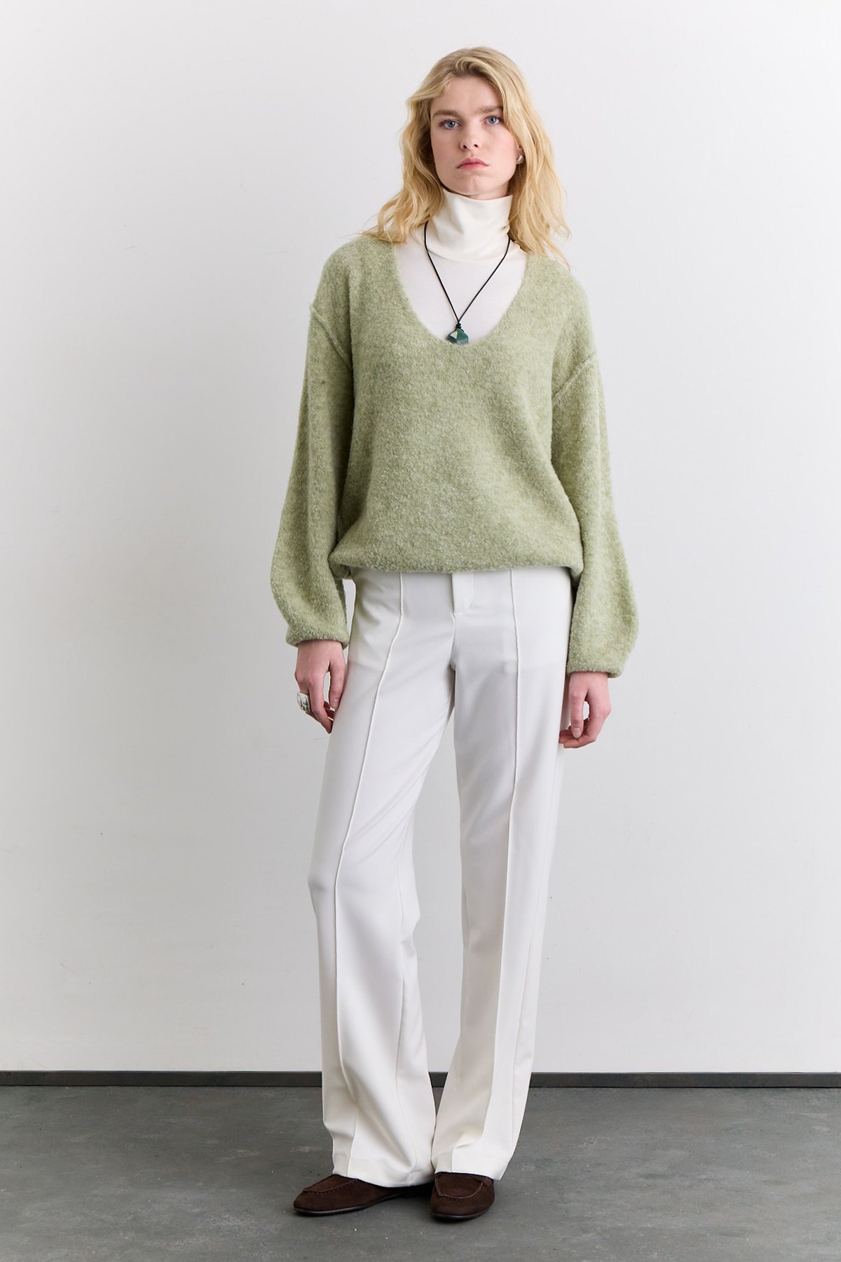 Normal kalıp,V yaka,uzun kol,ara boy,dokulu kazak.