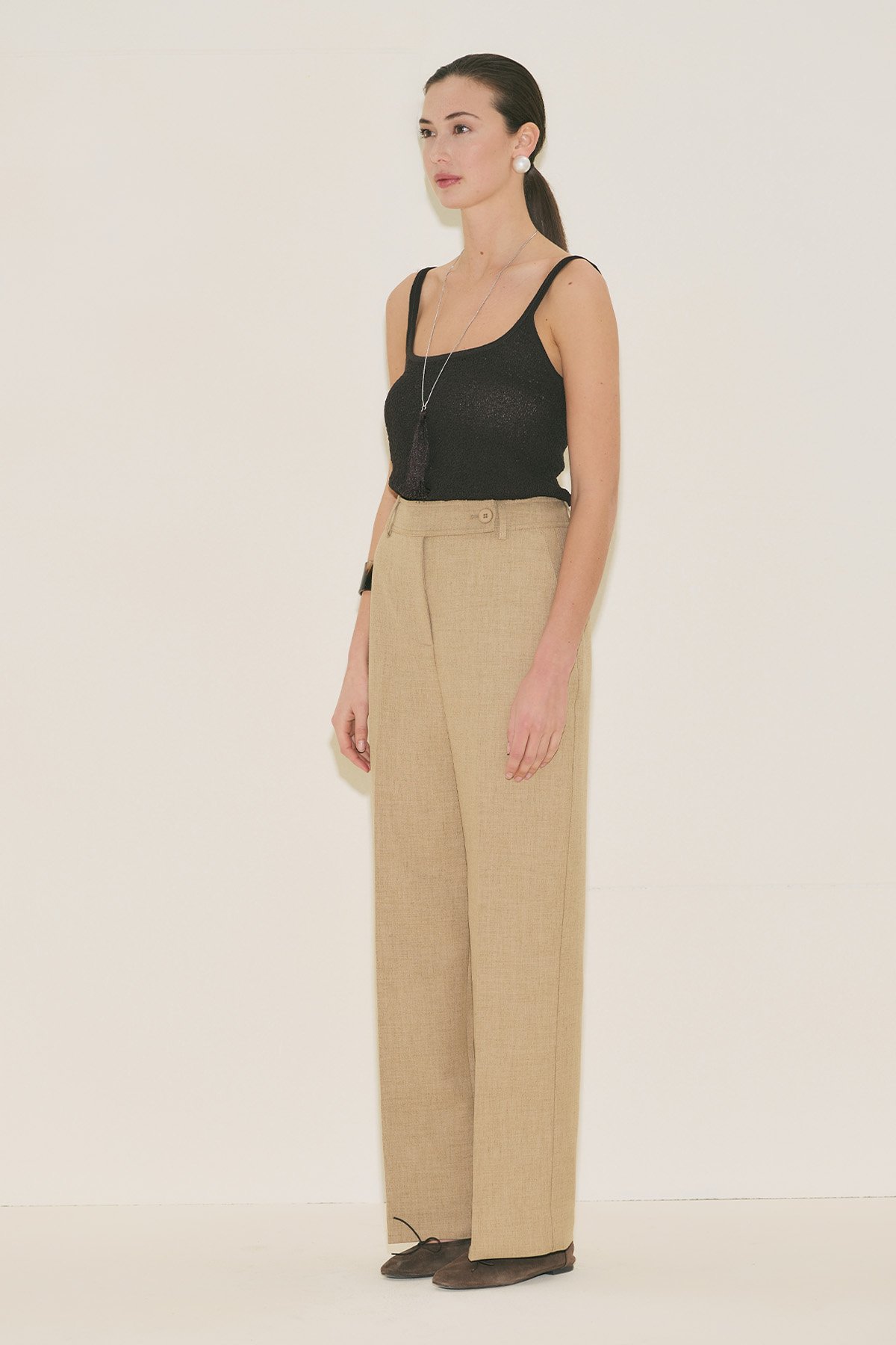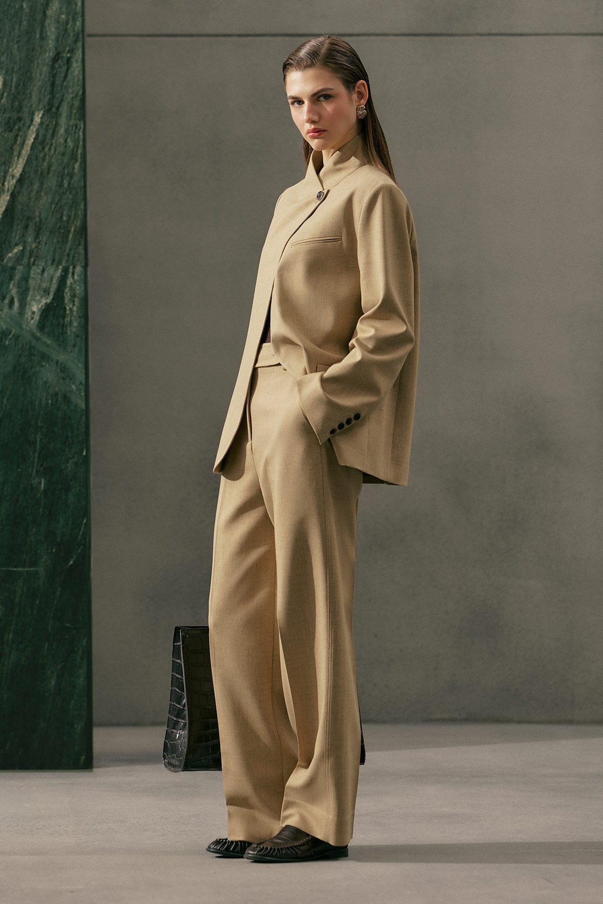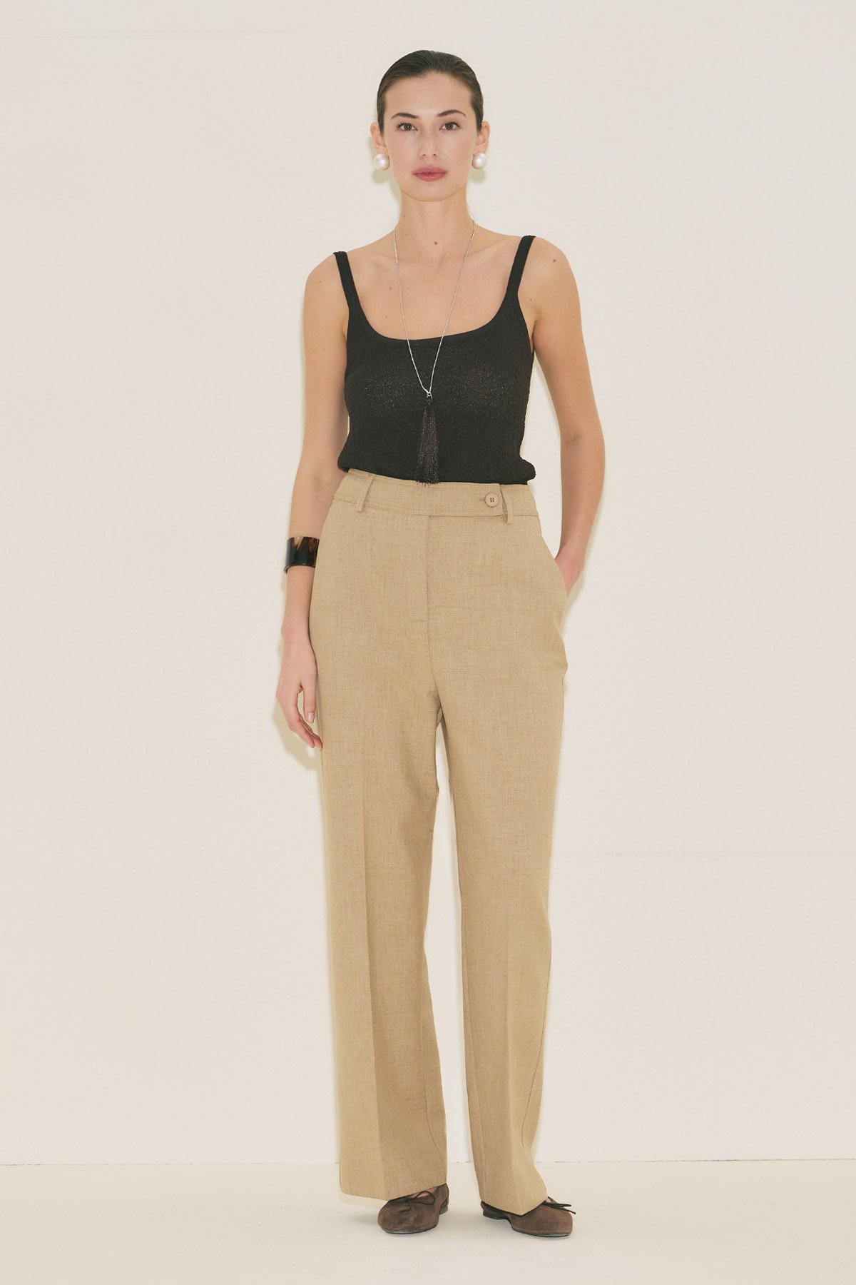 Straight form, tam boy, yüksek bel, geniş paça, cepli, düğme ve fermuar kapamalı.