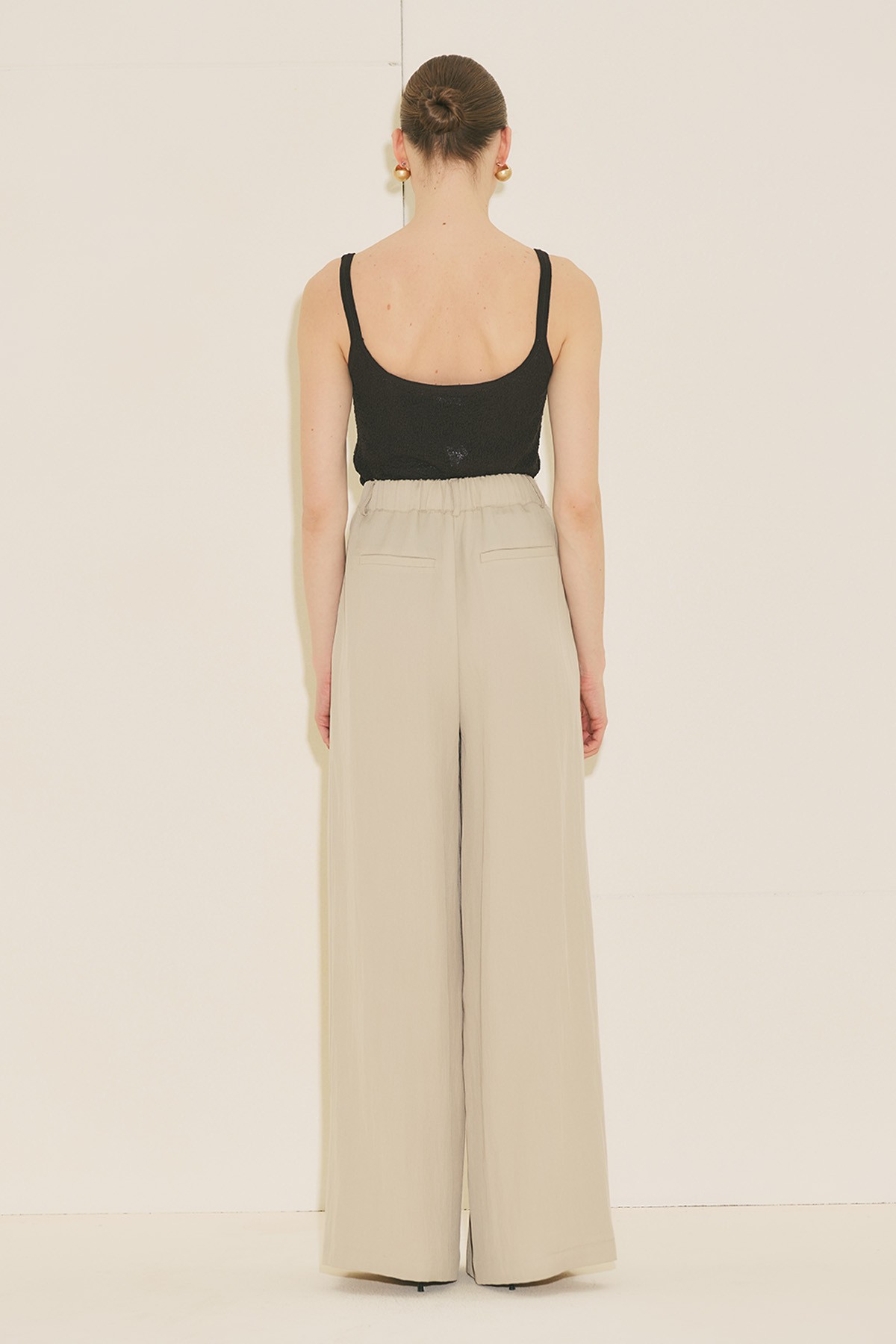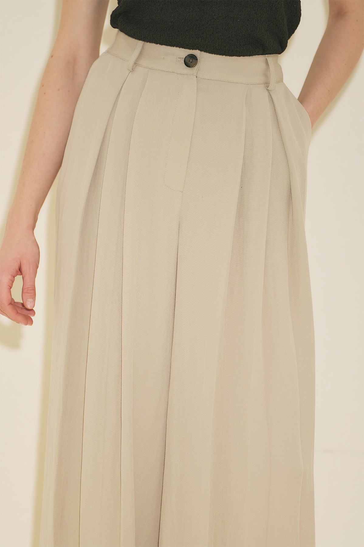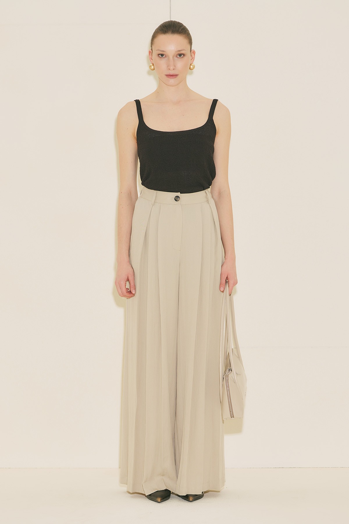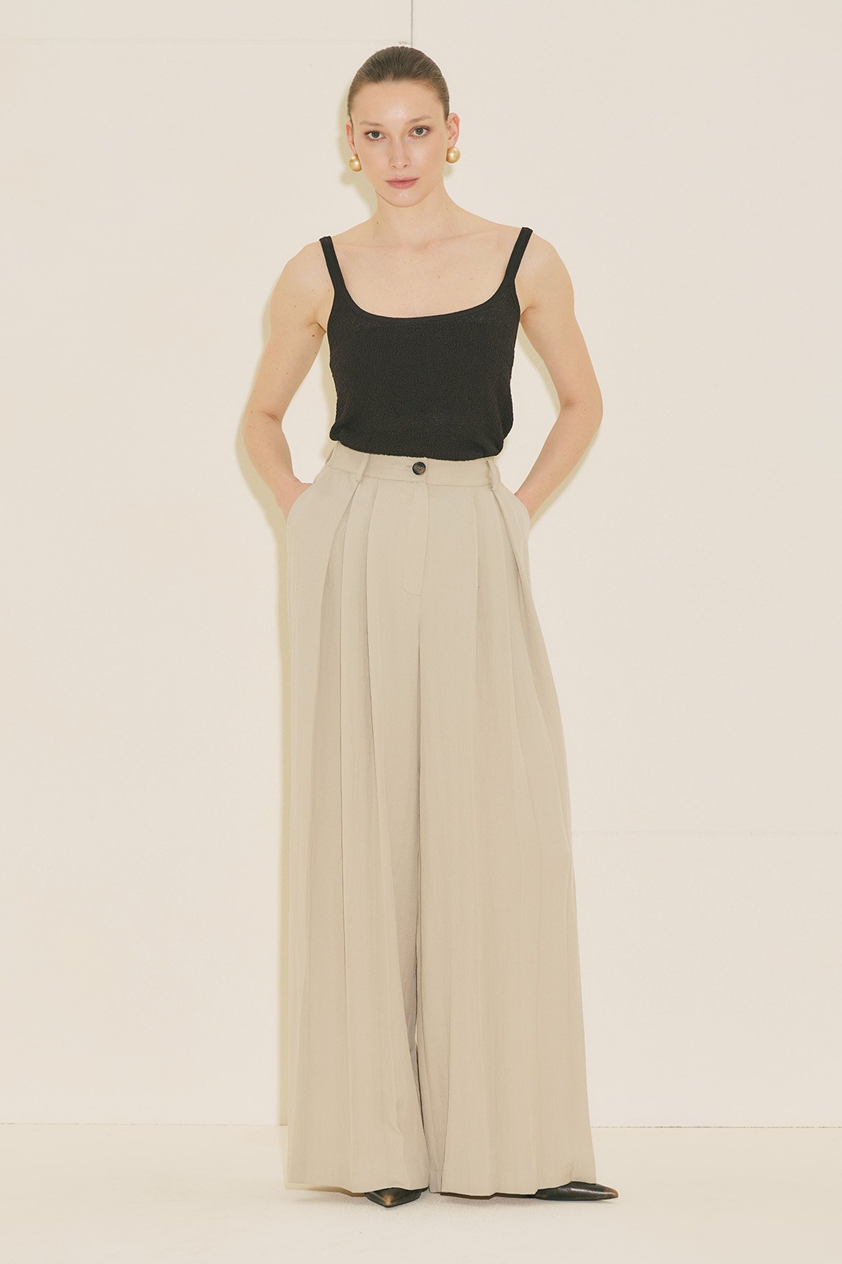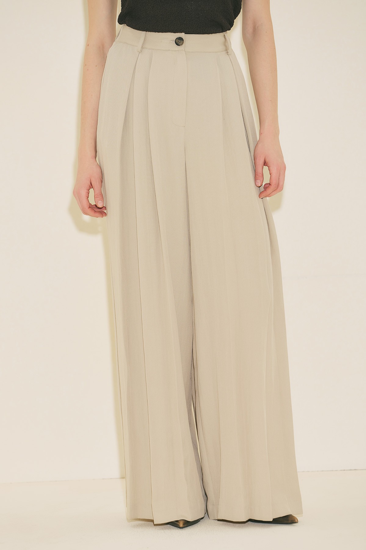 Geniş kalıp form, tam boy, yüksek bel, geniş paça form, geniş pileli, cepli, düğme ve fermuar kapamalı.