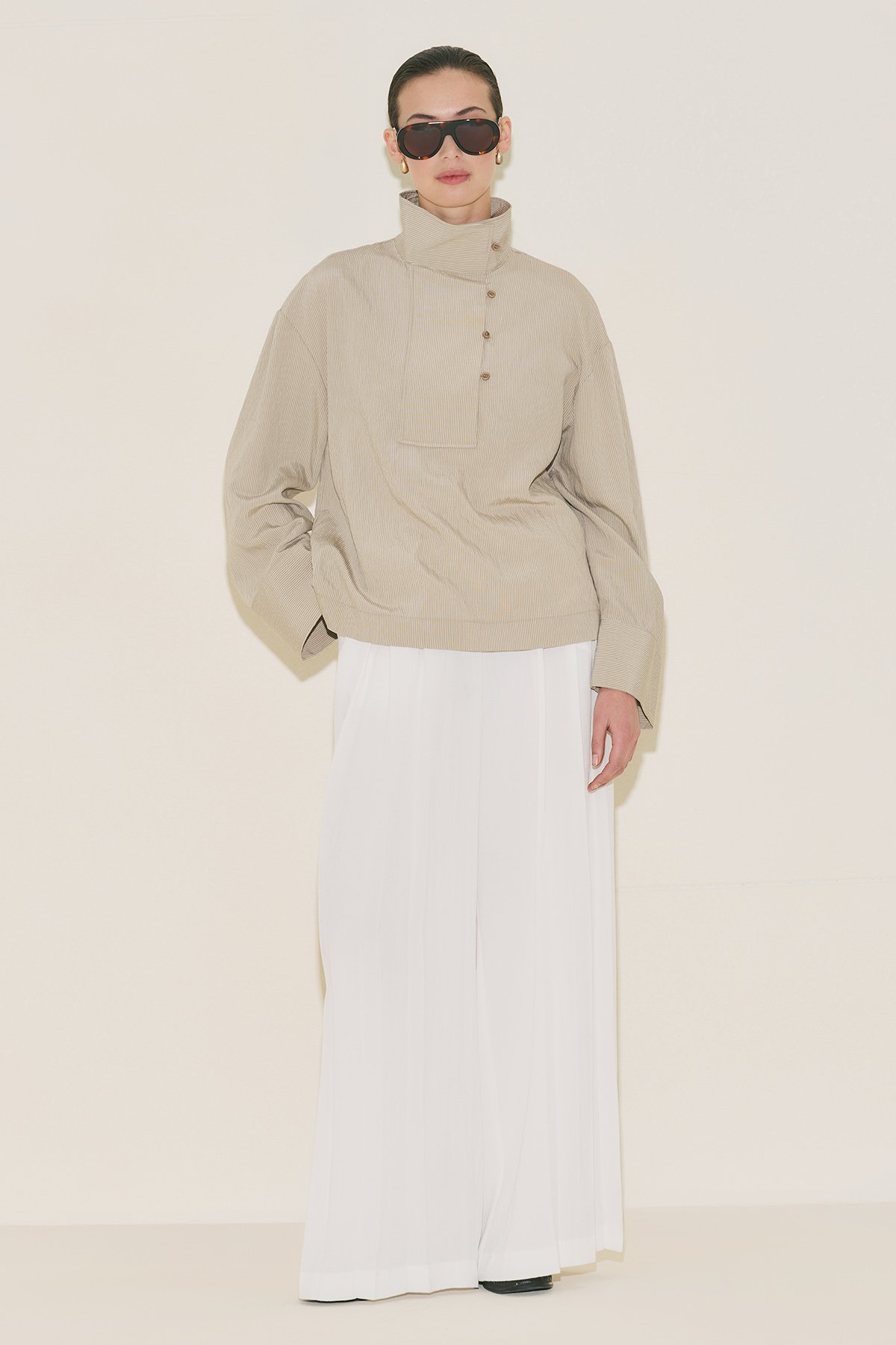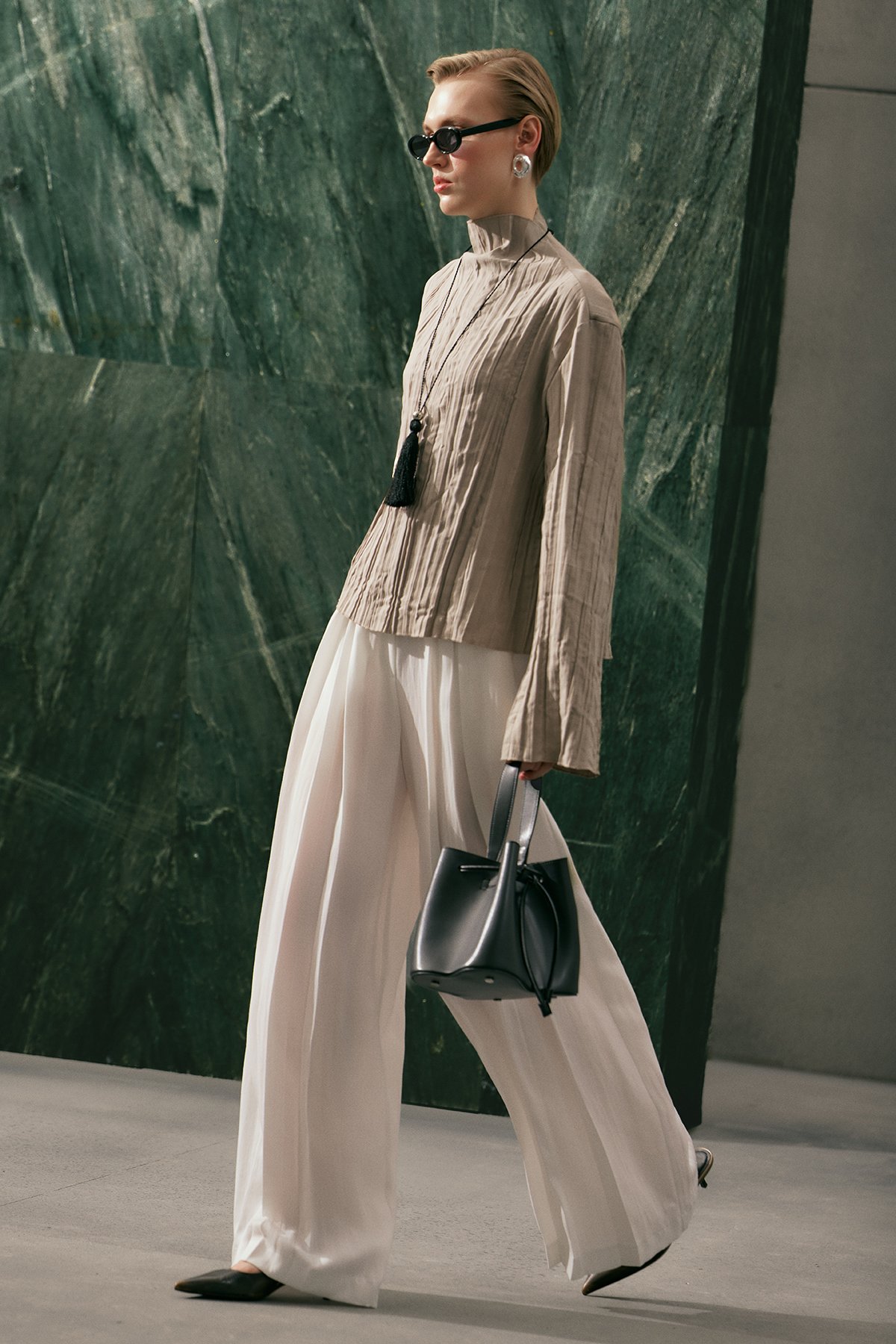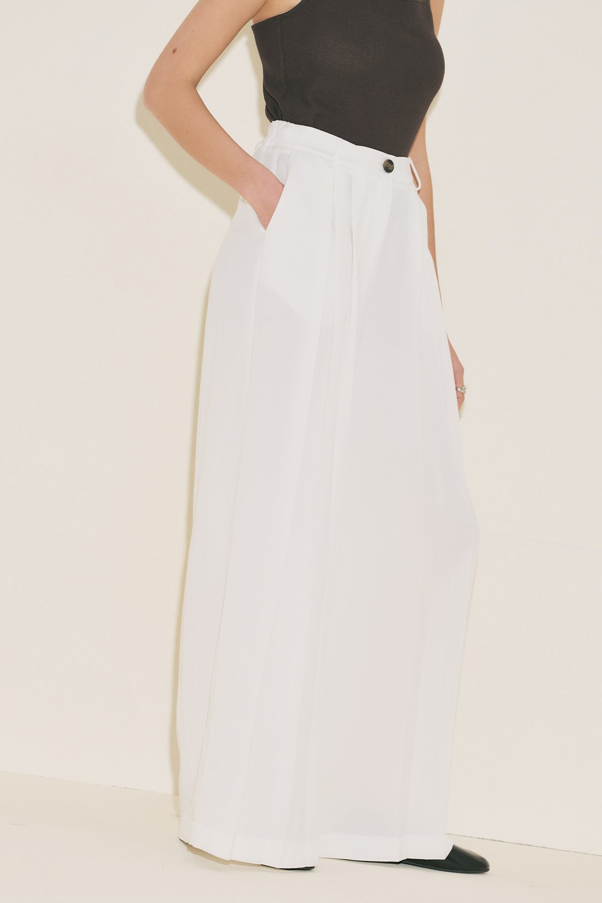 Geniş kalıp form, tam boy, yüksek bel, geniş paça form, geniş pileli, cepli, düğme ve fermuar kapamalı.