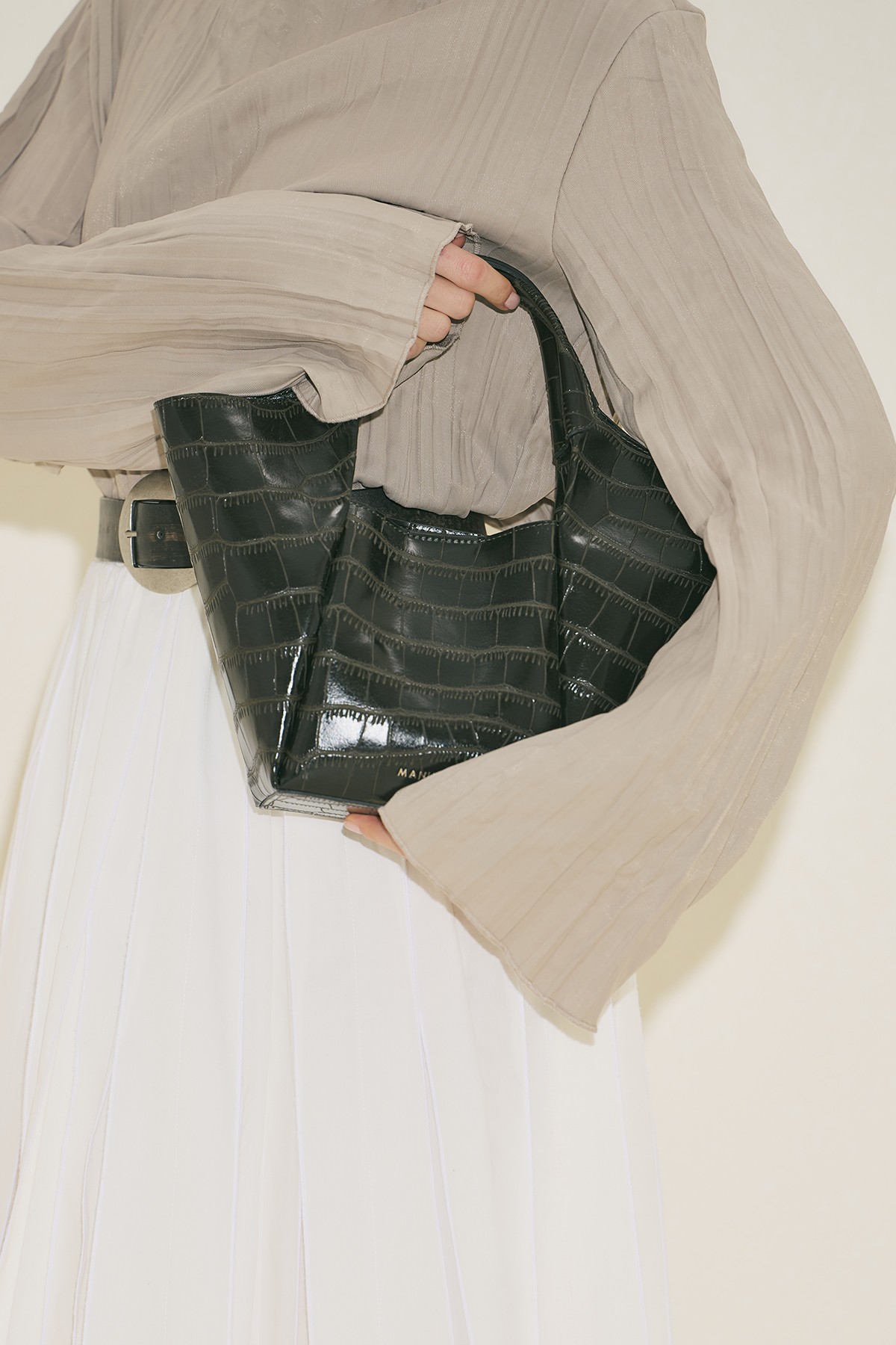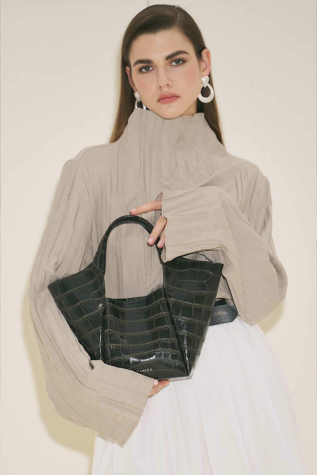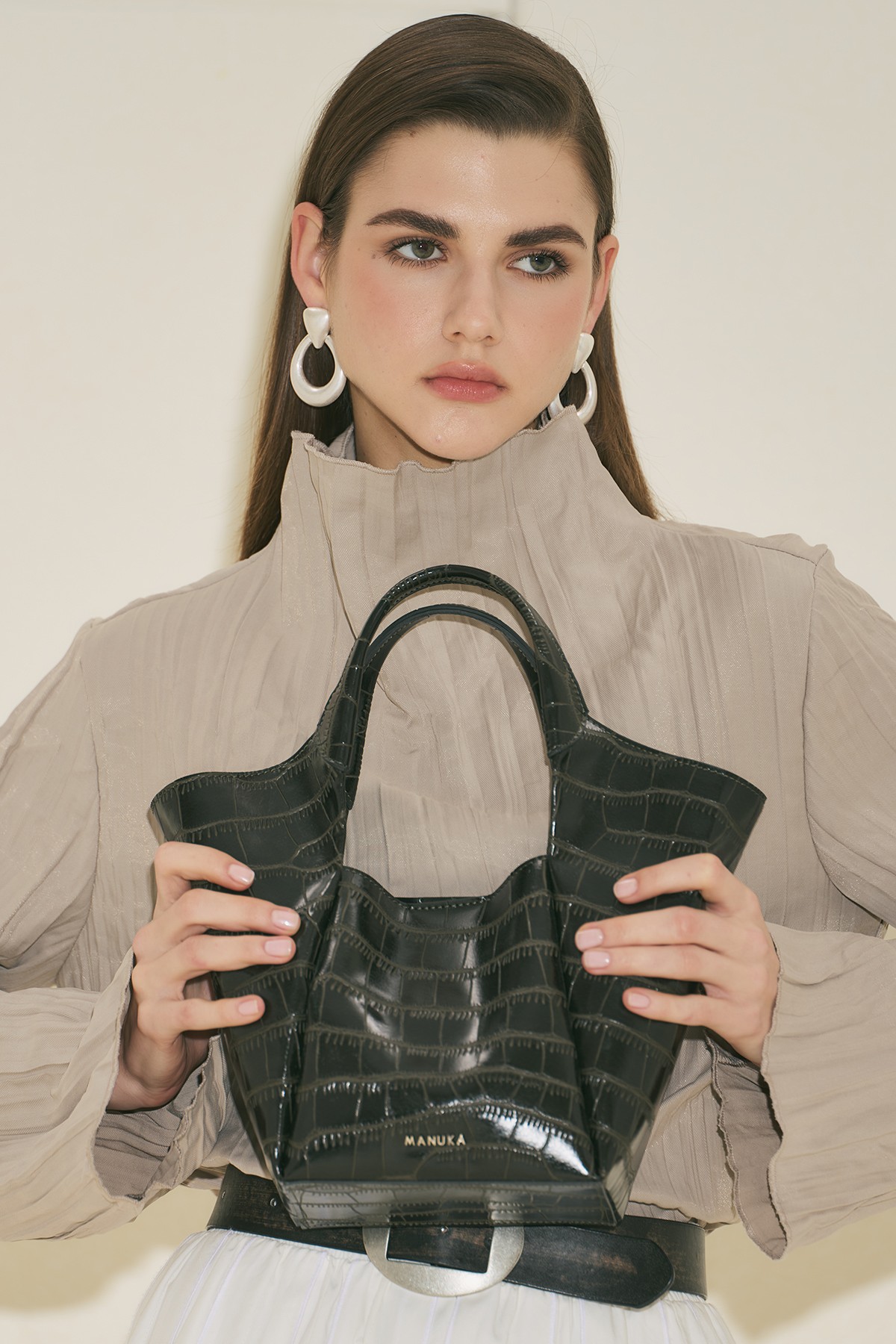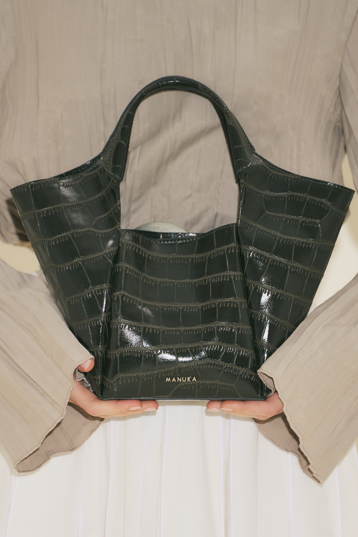 Orta boy, kabartma desenli, manuka logolu, çıtçıt kapamalı, suni deri, astarsız.