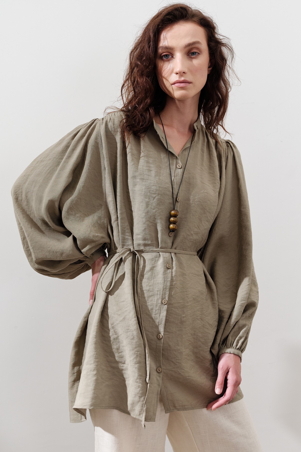 Round neckline, balloon sleeves, tunic length, gathered detail on upper sleeves, elasticated cuffs, beltedFabric: 86% Modal, 14% Polyester