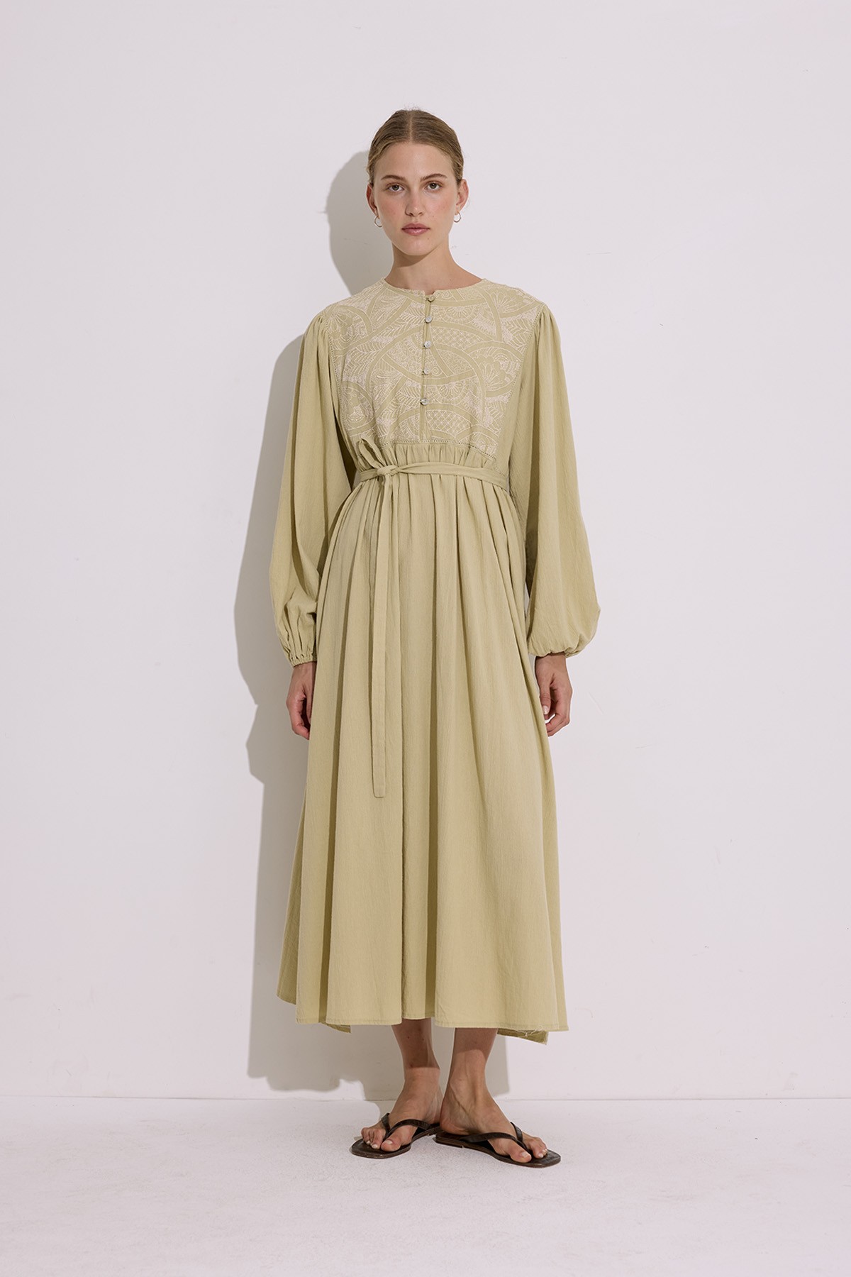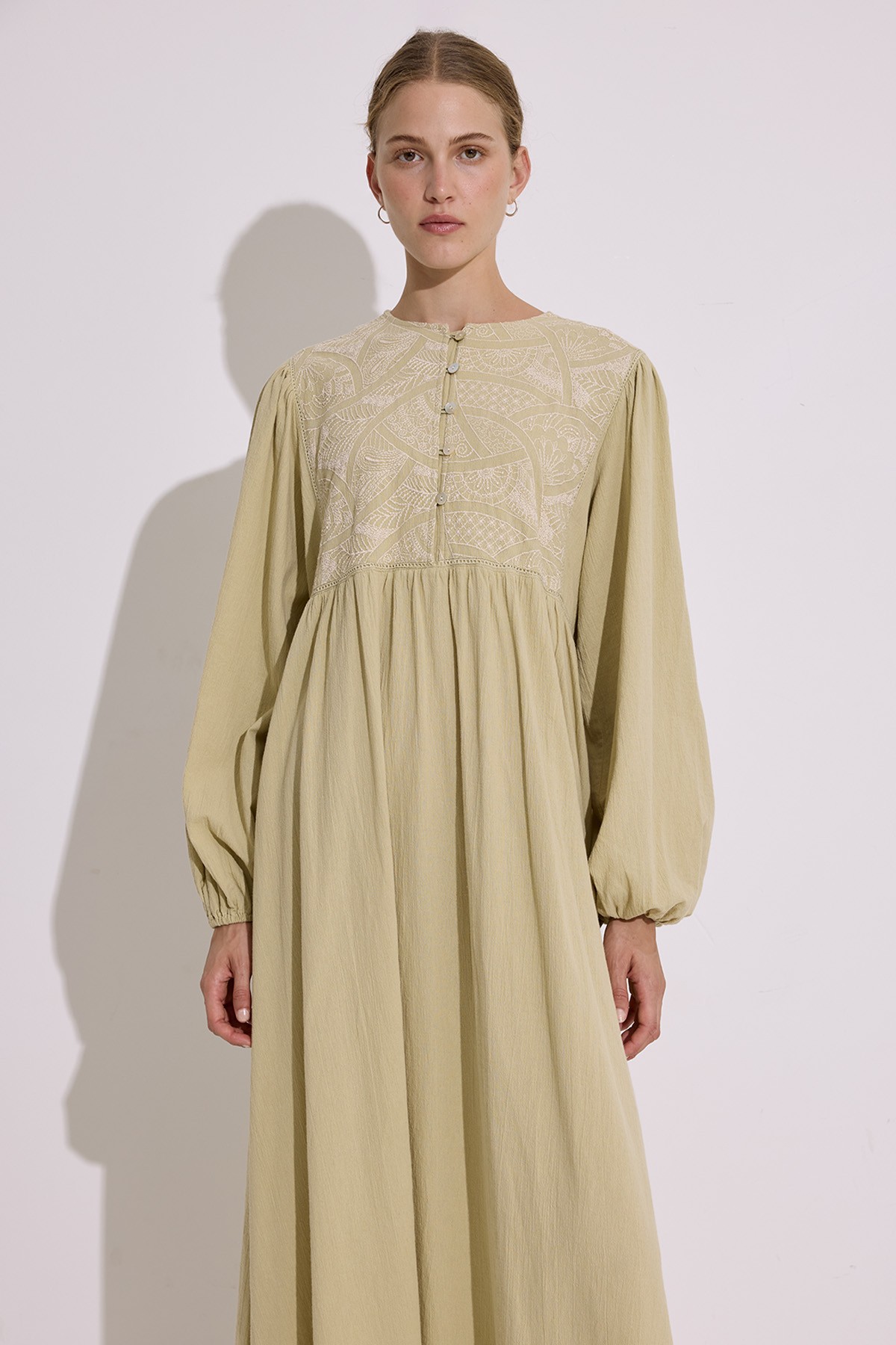 TEXTURED EMBROIDERED DRESS SOFT GREEN