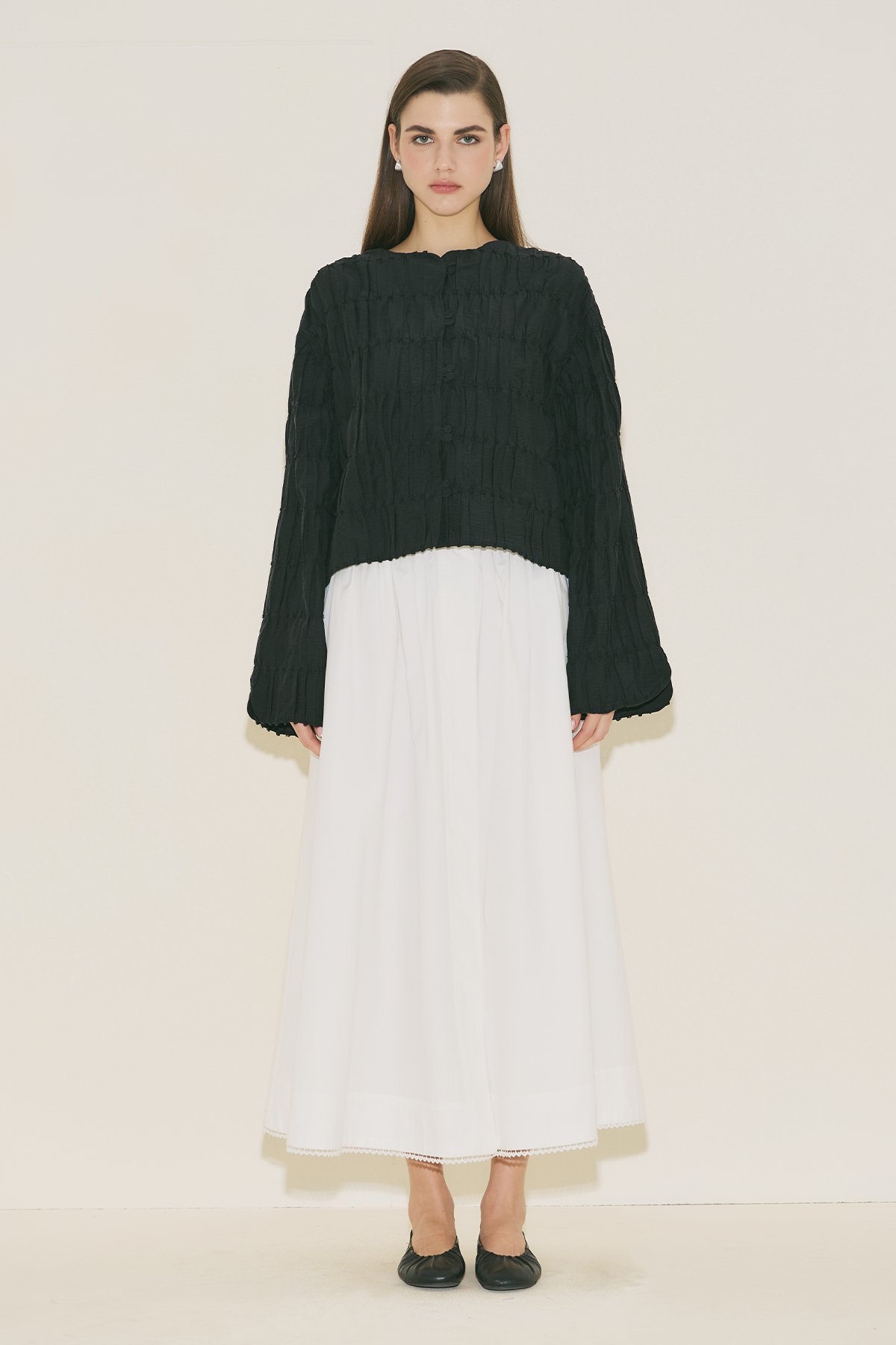 Regular fit, round neck, long sleeves, crop length, textured, self-fabric button detail, button closure.