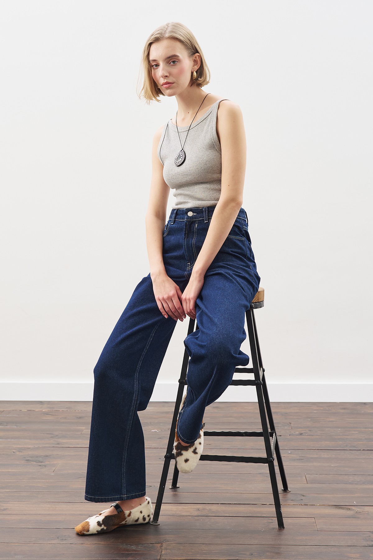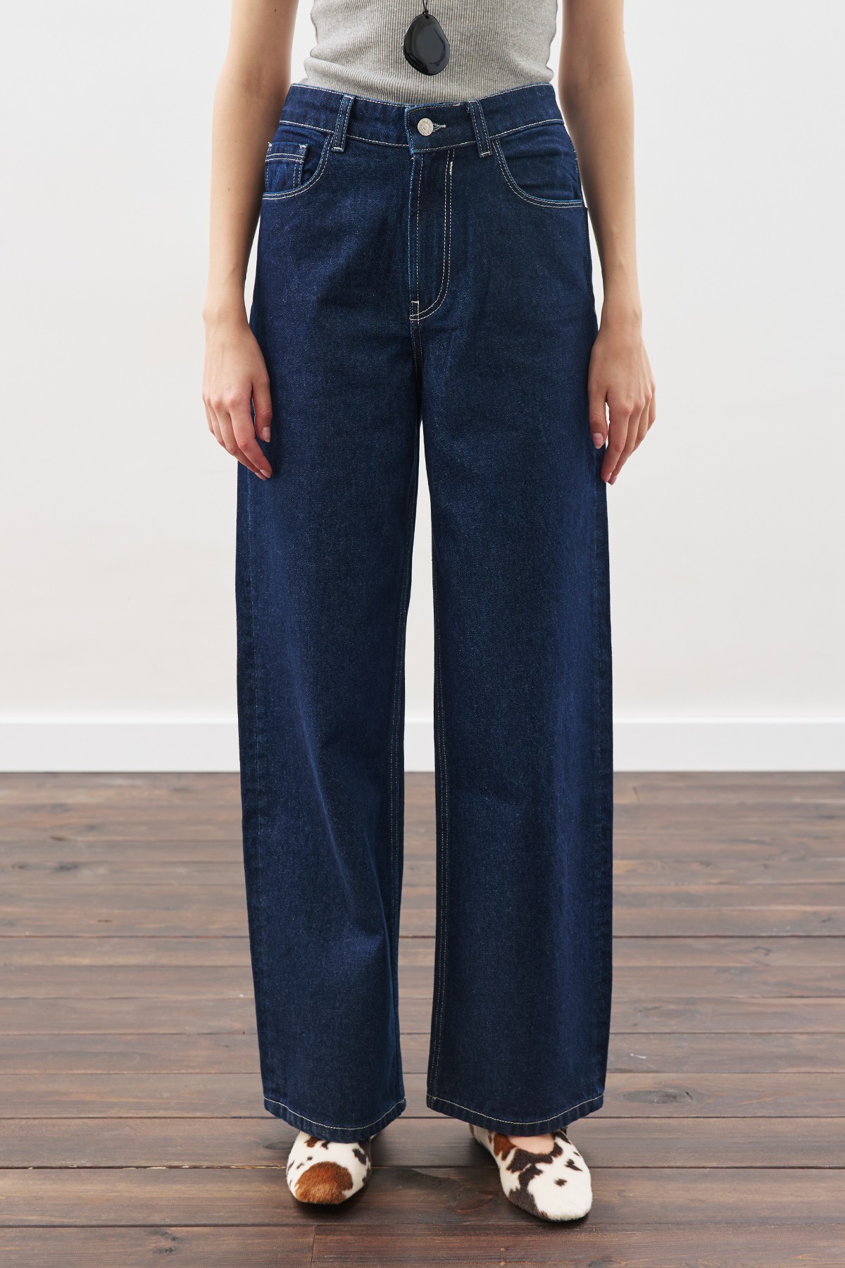 UZUN HAFİF GENİŞ PAÇA JEAN PANTOLON KOYU MAVİ