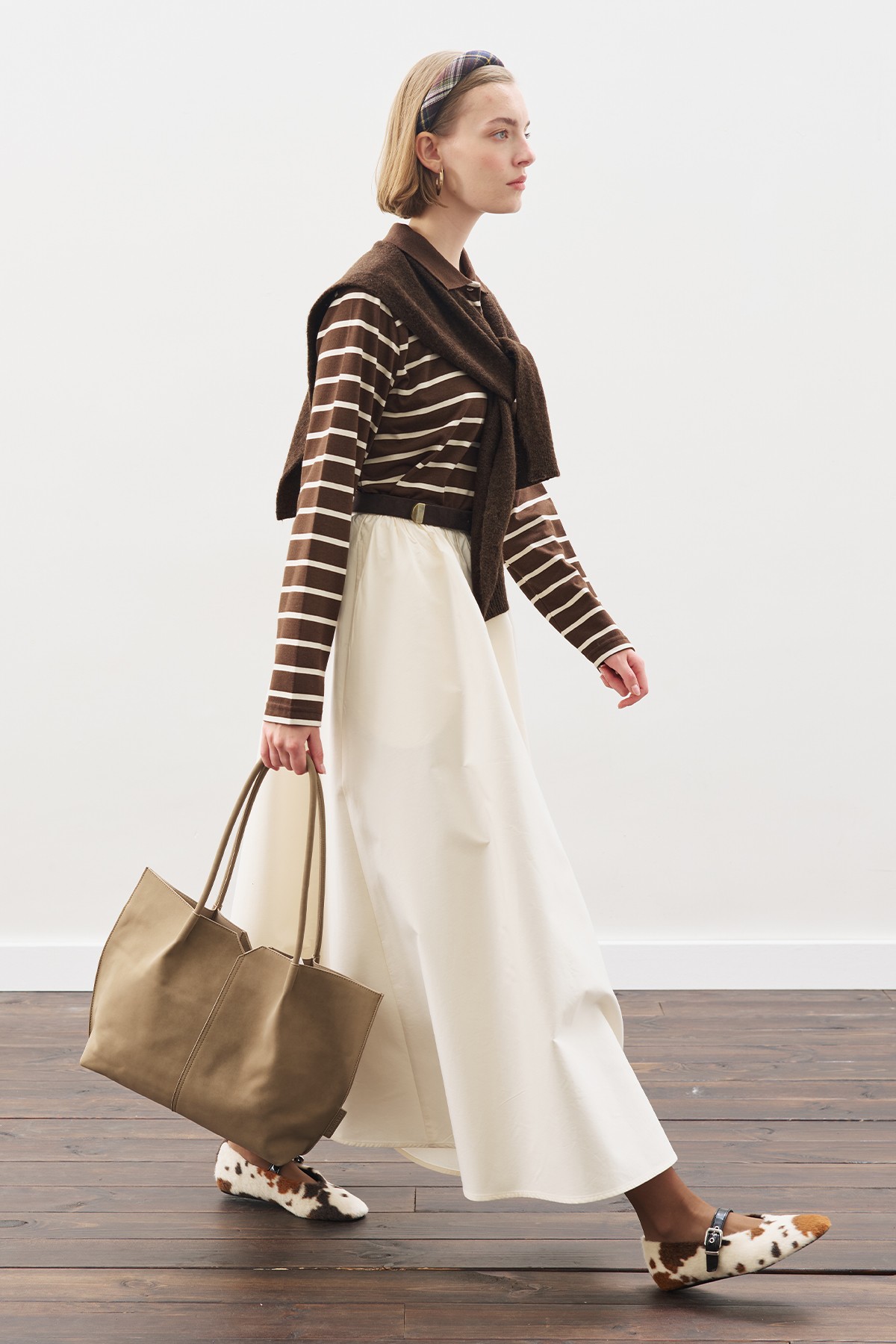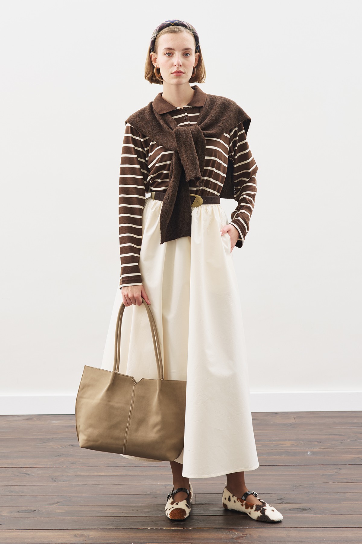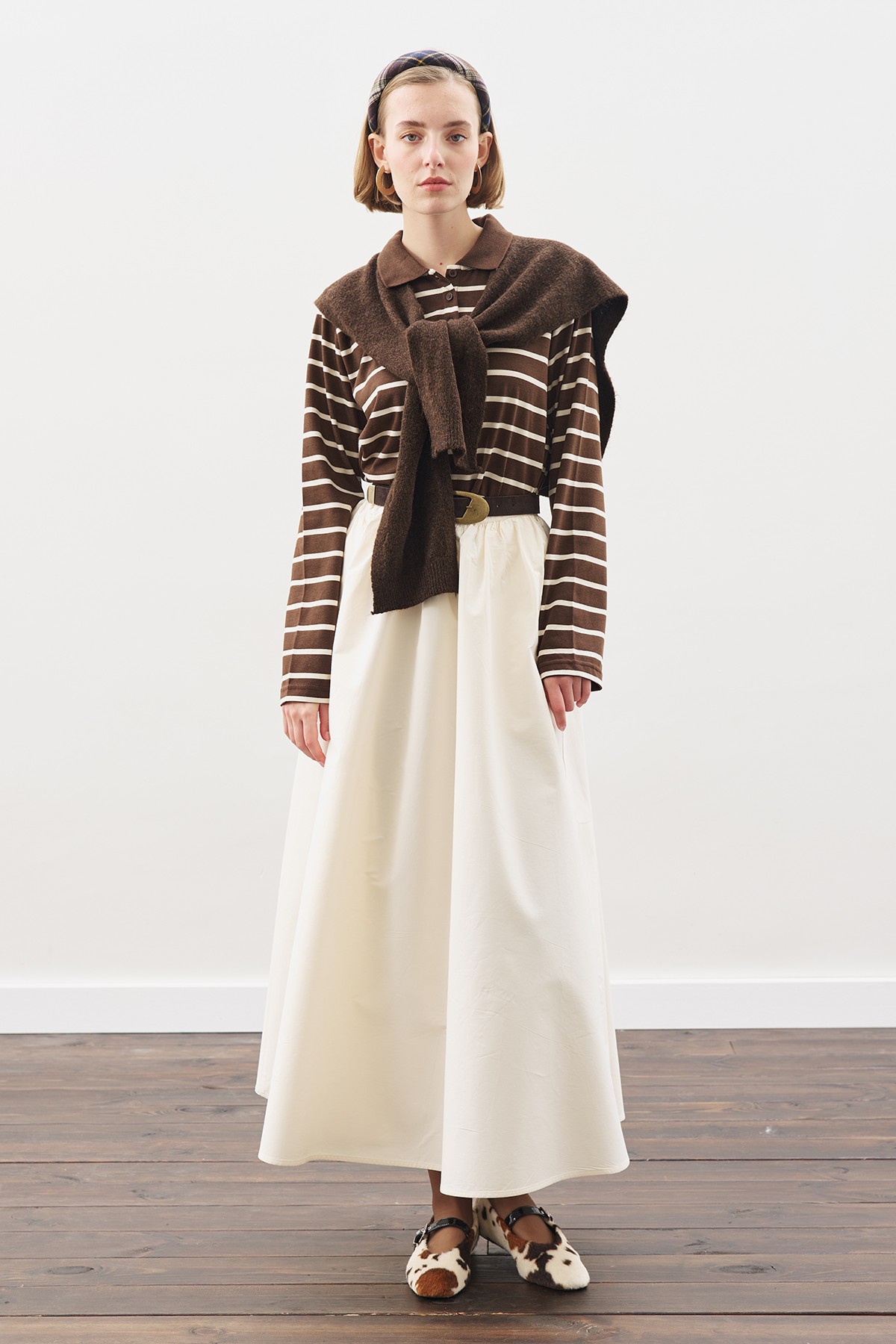 Beli büzgülü, Yandan gizli fermuar kapamalı, Astarsız, yanlardan cepli, Pamuklu poplin kumaştan üretilmiştir, Kumaş tela ile ekstra beslenmiştir, Uygun iç çamaşırı kullanılmadığında açık renklerde iç gösterme durumu görülebilir.%100 Pamuk