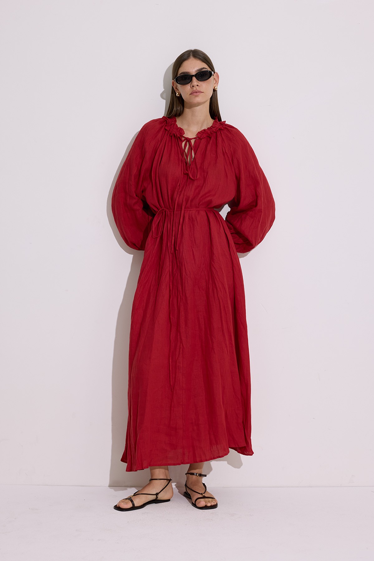 YAKASI BÜZGÜLÜ KETEN GENİŞ ELBİSE KIRMIZI