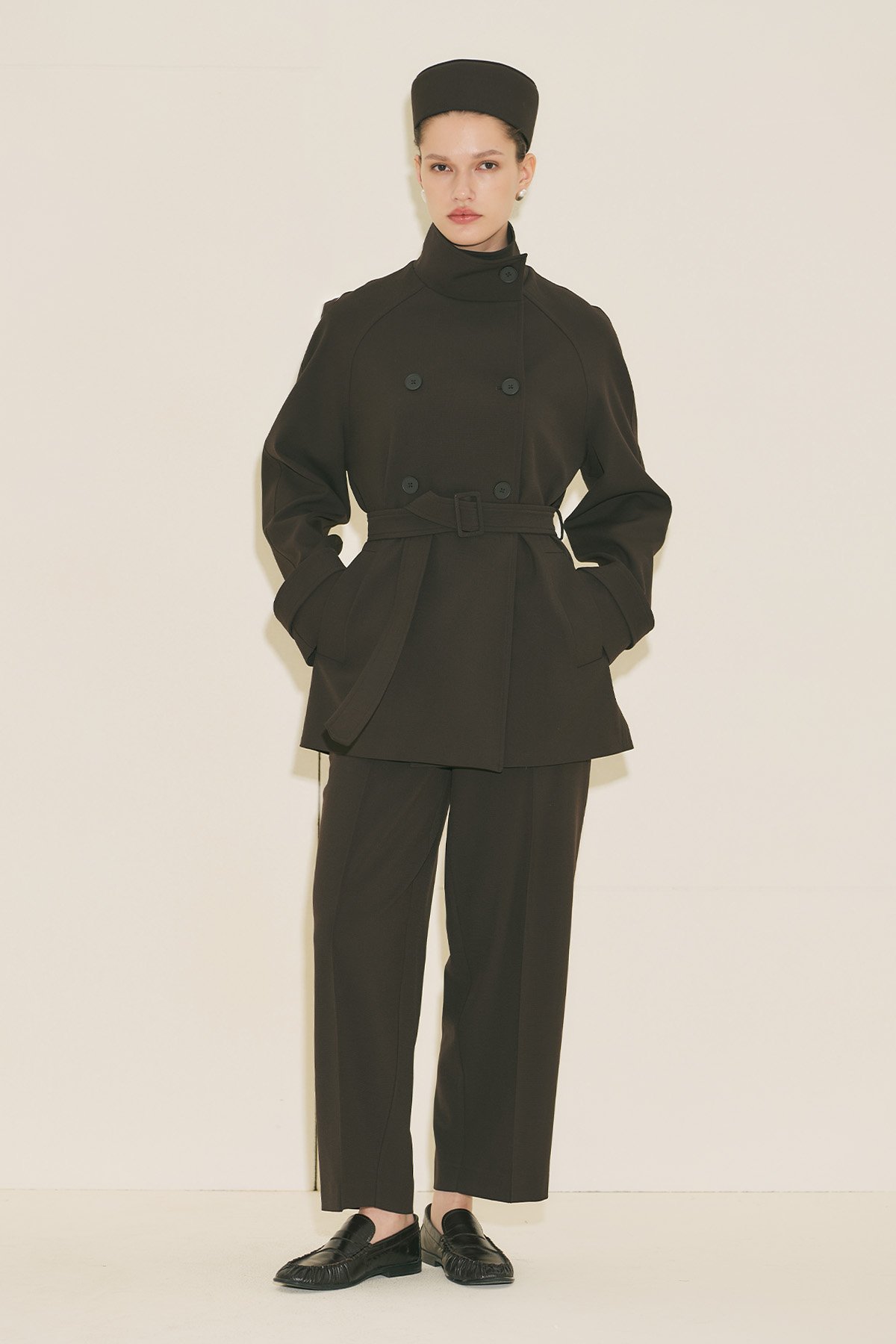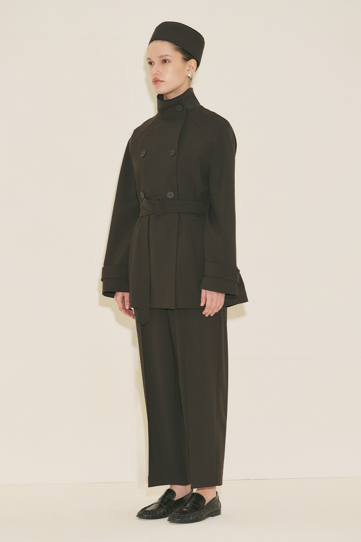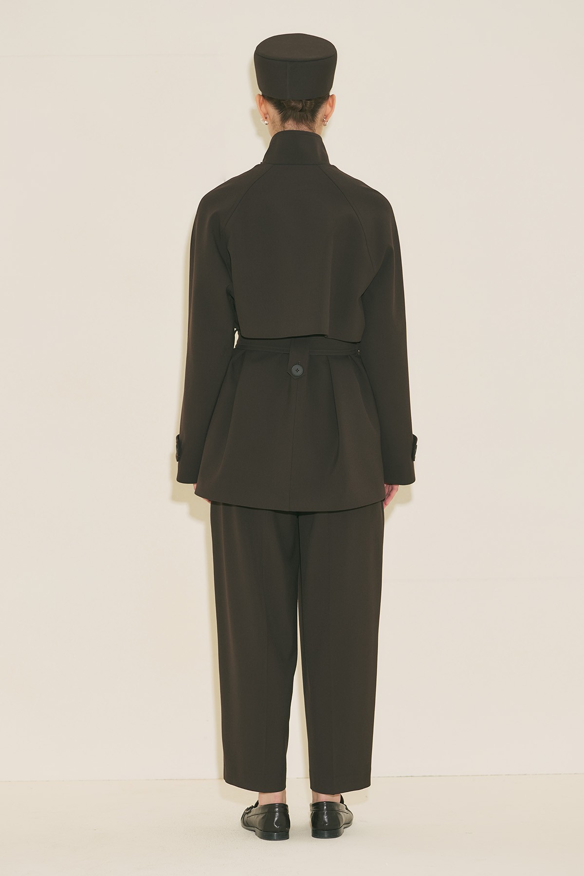 Regular form, yüksek yaka, reglan uzun kol, ara boy, düğme kapamalı.