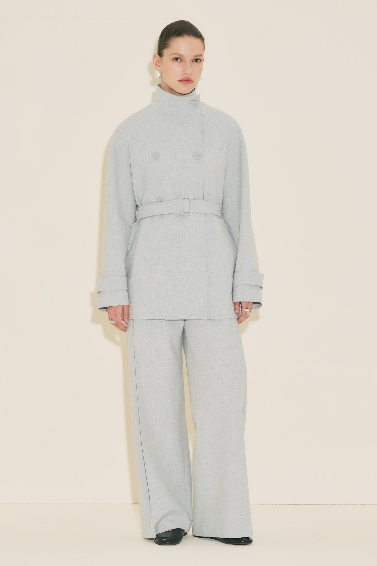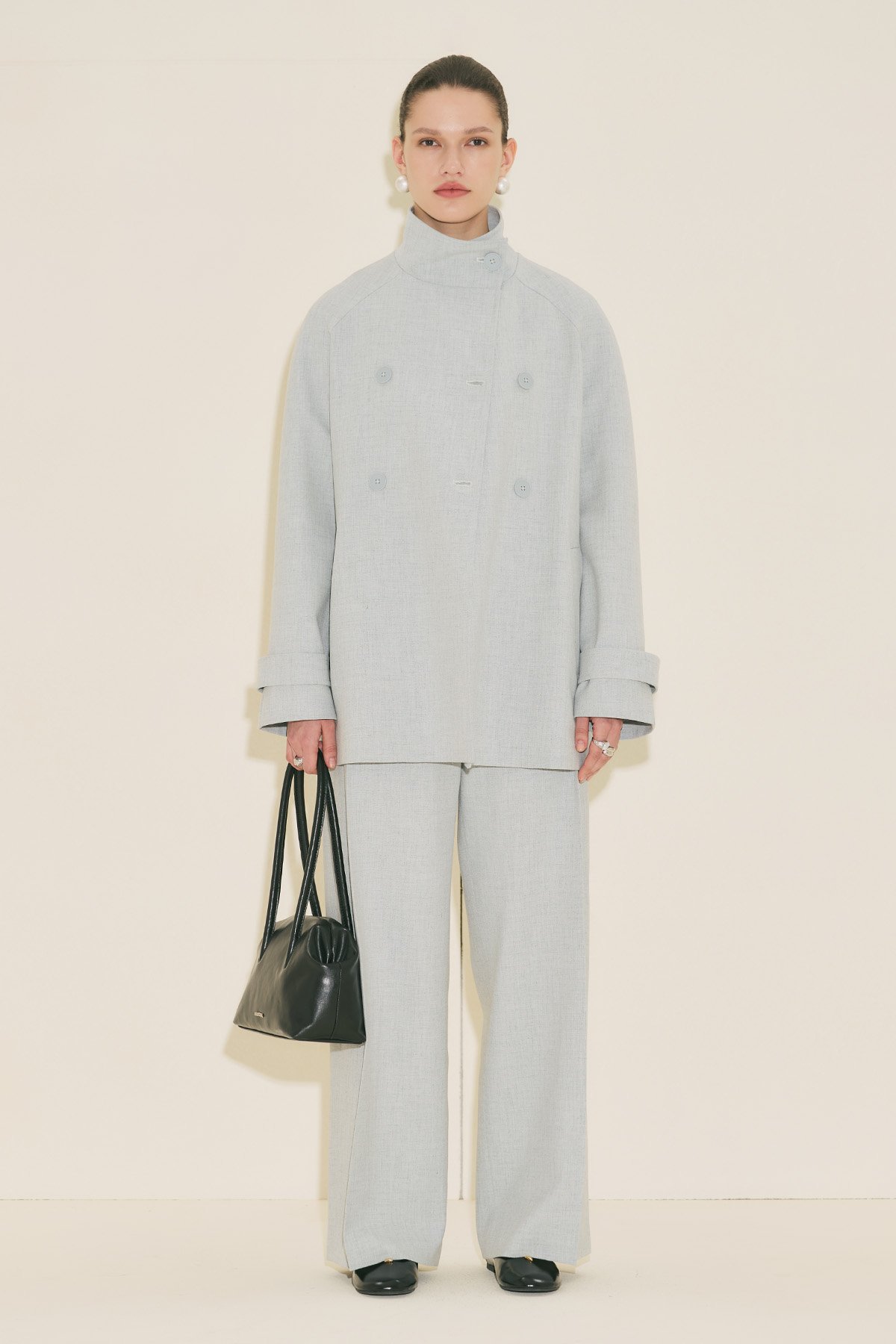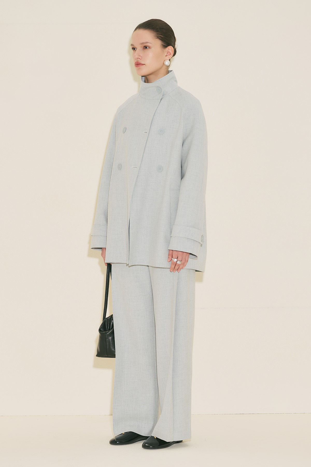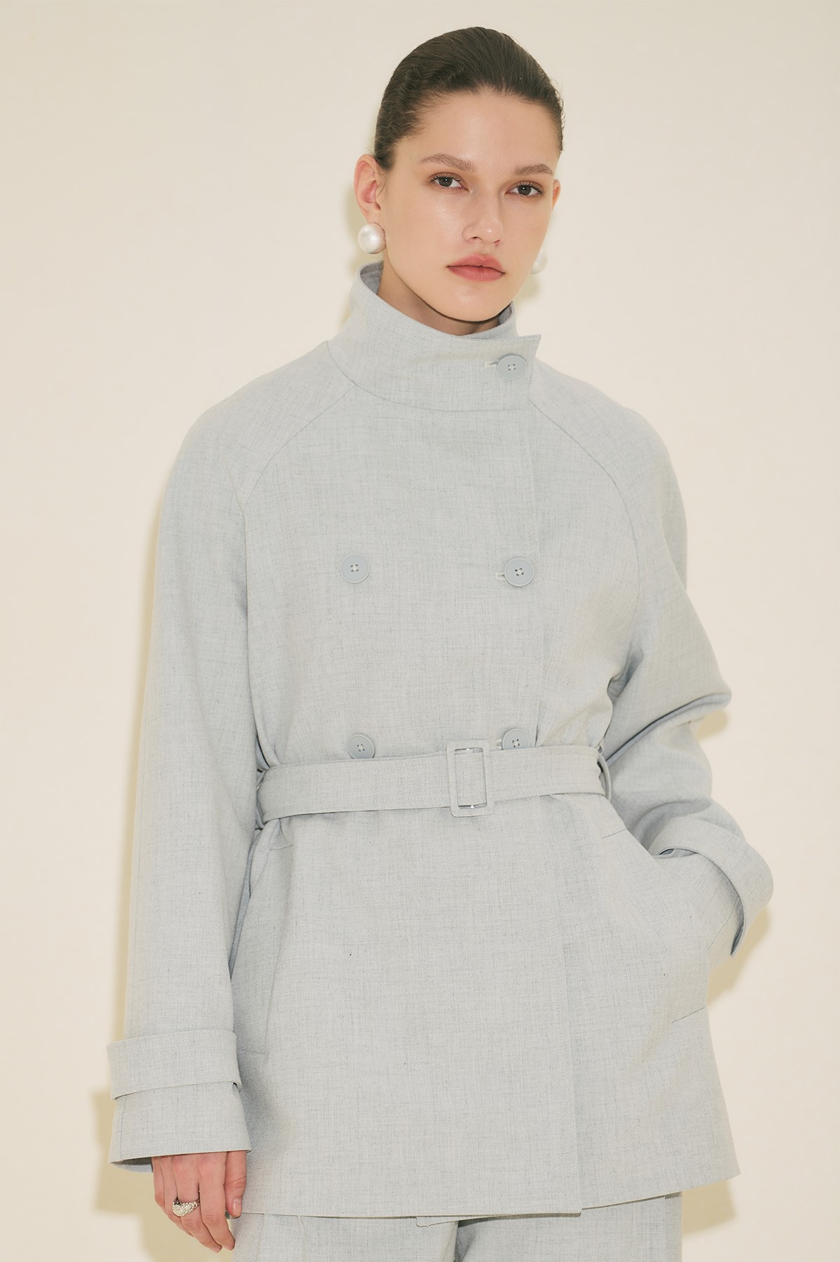 Regular form, yüksek yaka, reglan uzun kol, ara boy, düğme kapamalı.
