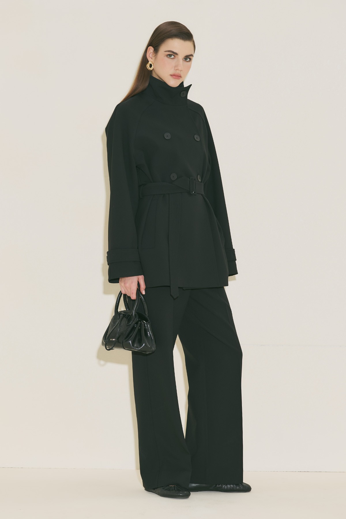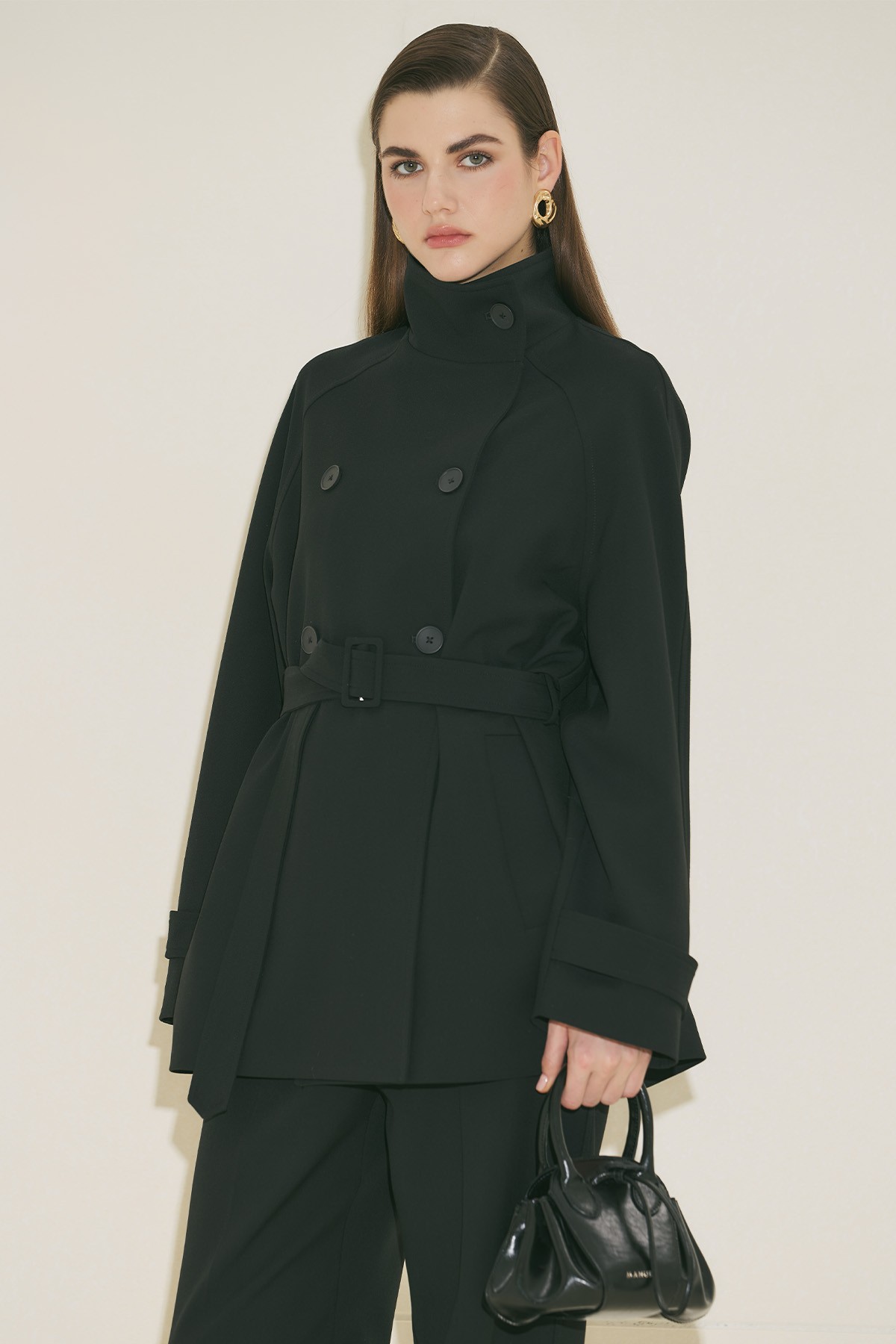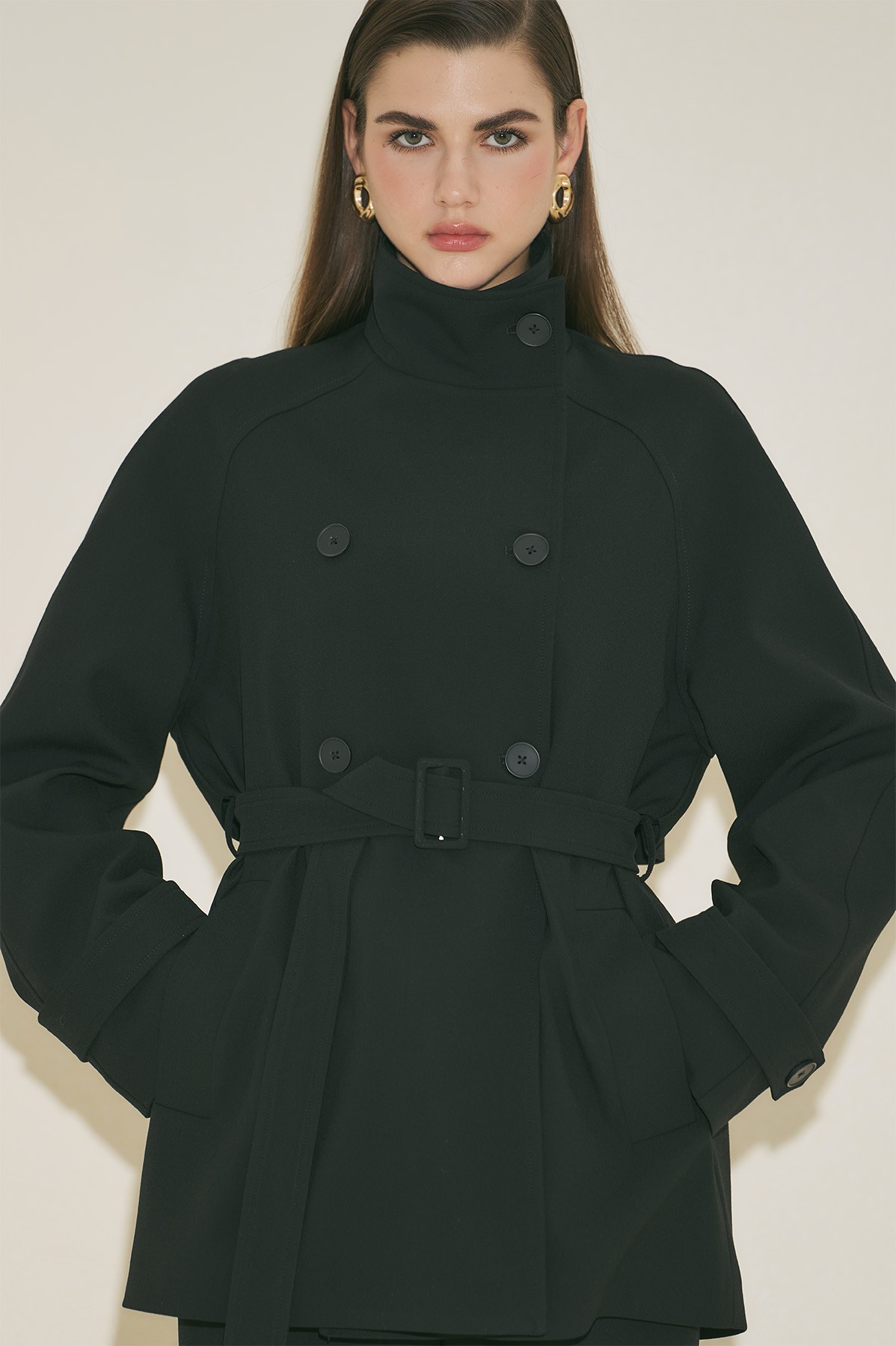 Regular form, yüksek yaka, reglan uzun kol, ara boy, düğme kapamalı.