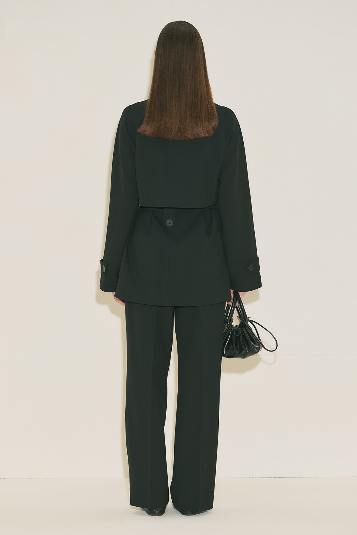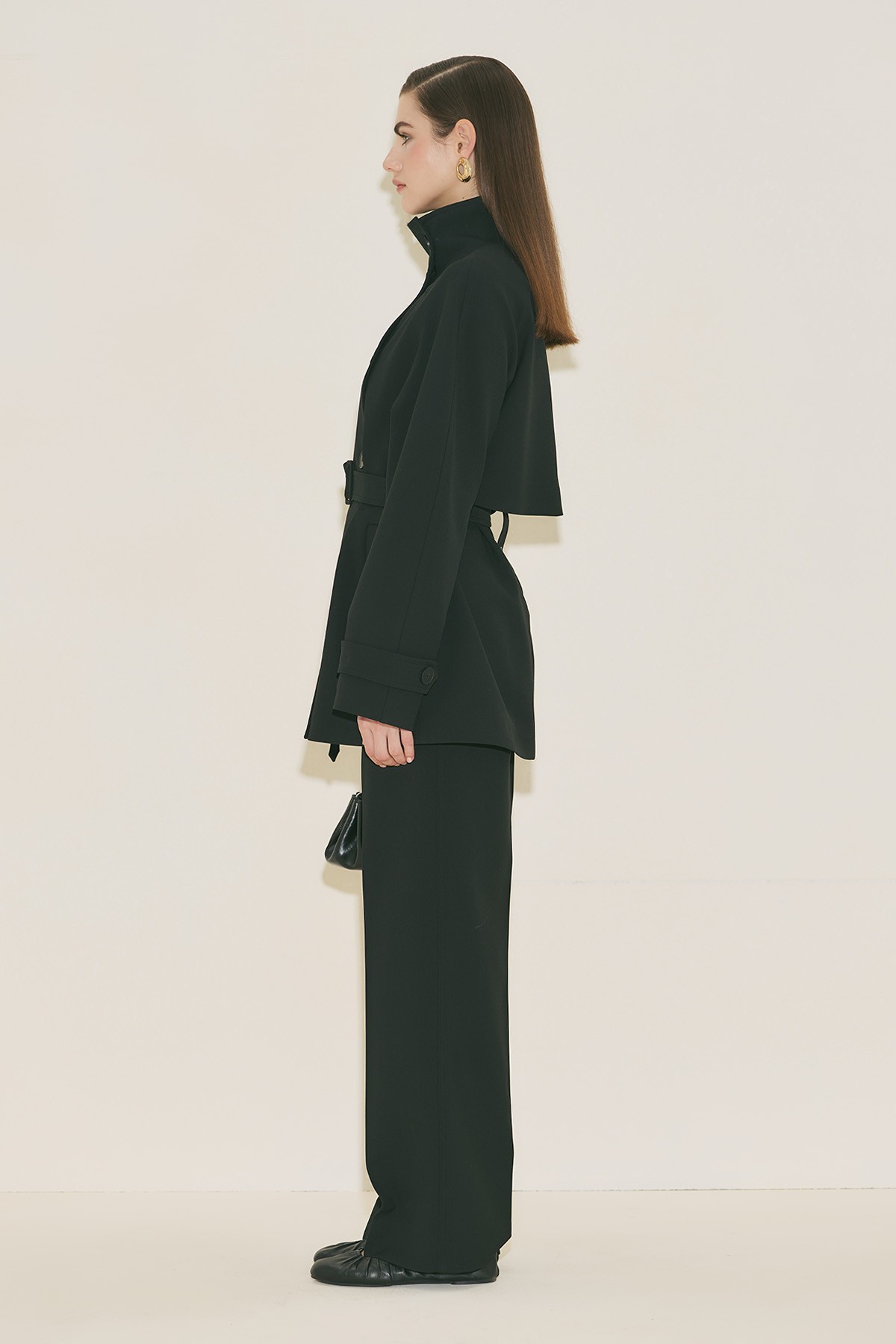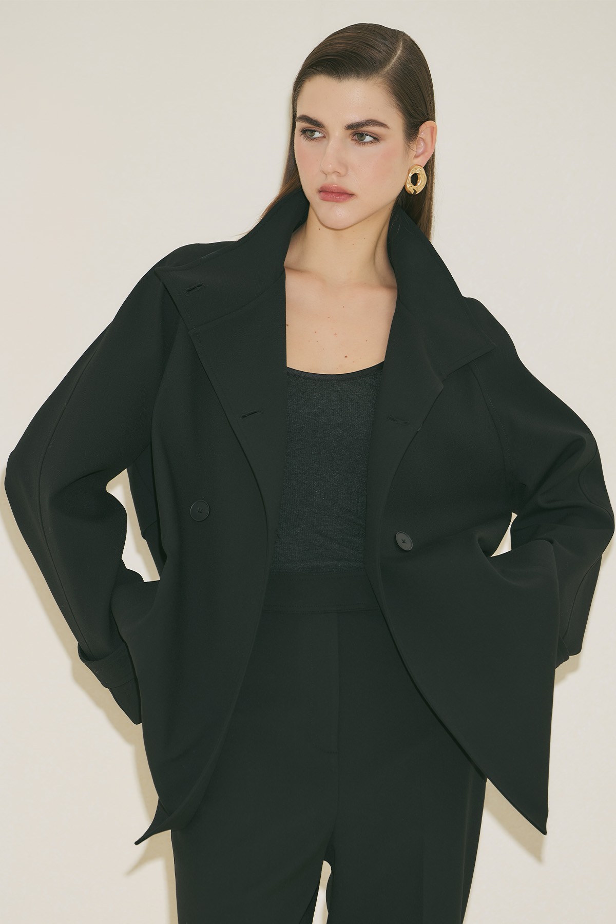 Regular form, yüksek yaka, reglan uzun kol, ara boy, düğme kapamalı.