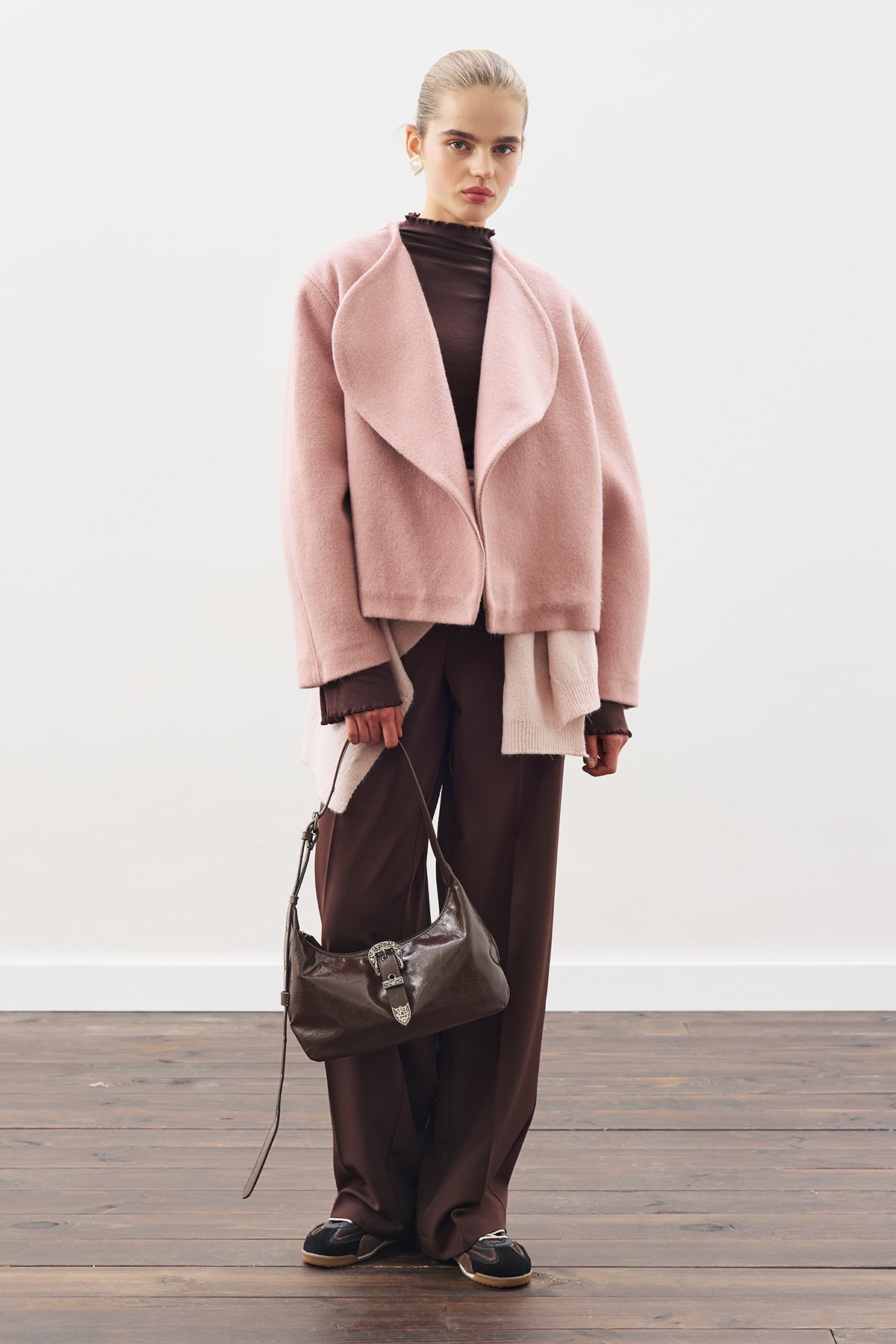 Geniş yakalı, uzun kollu, crop boy, düz kapamalı, normal kalıp, dokuma kumaş.Ana Kumaş %28 Yün %72 Polyester