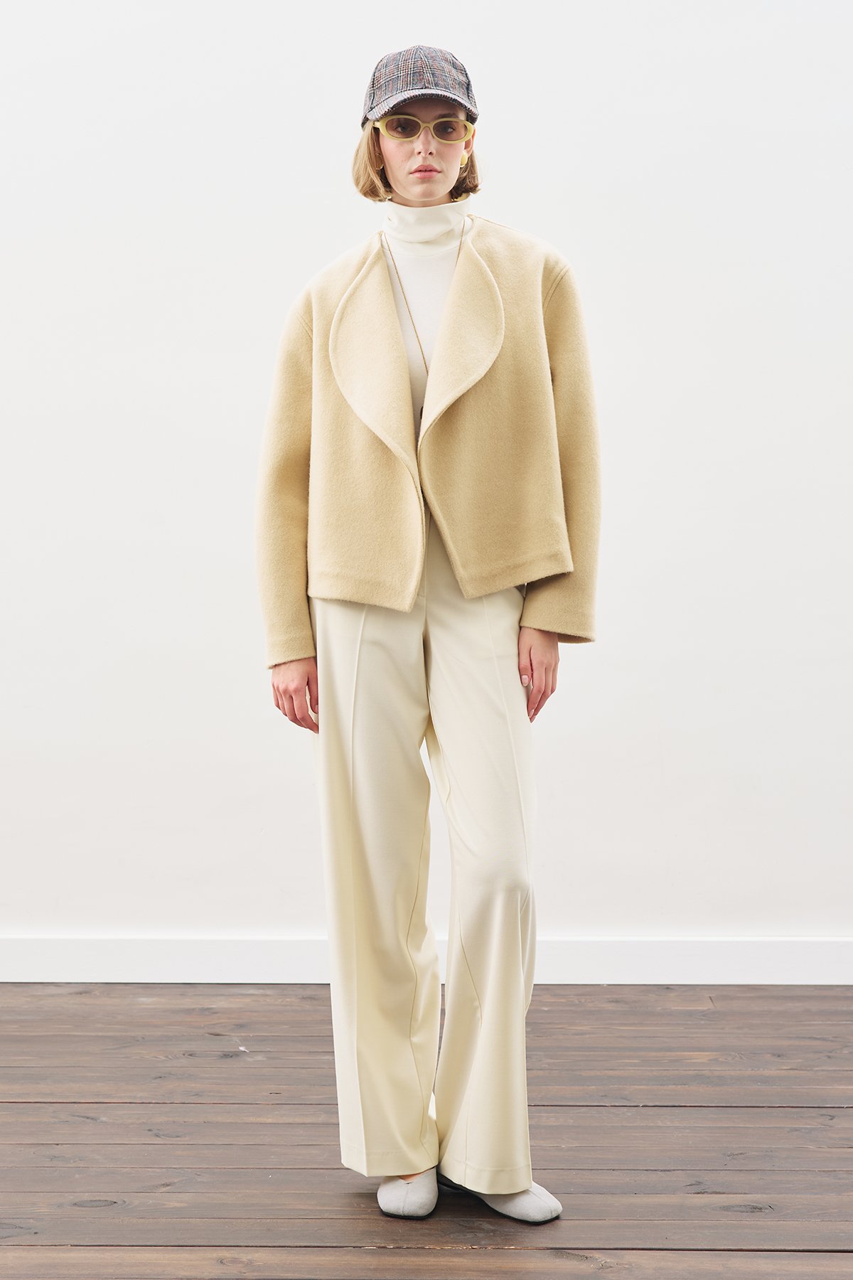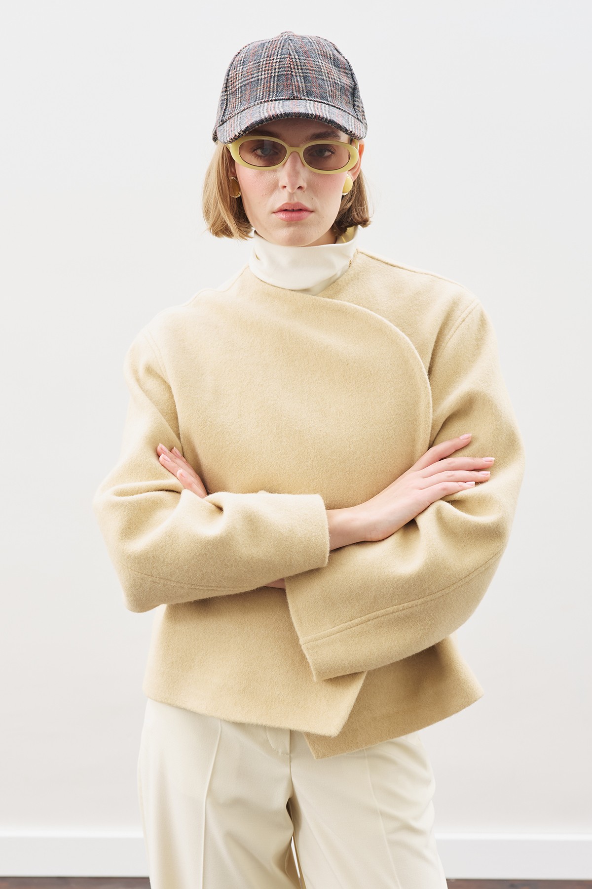 Geniş yakalı, uzun kollu, crop boy, düz kapamalı, normal kalıp, dokuma kumaş.Ana Kumaş %28 Yün %72 Polyester